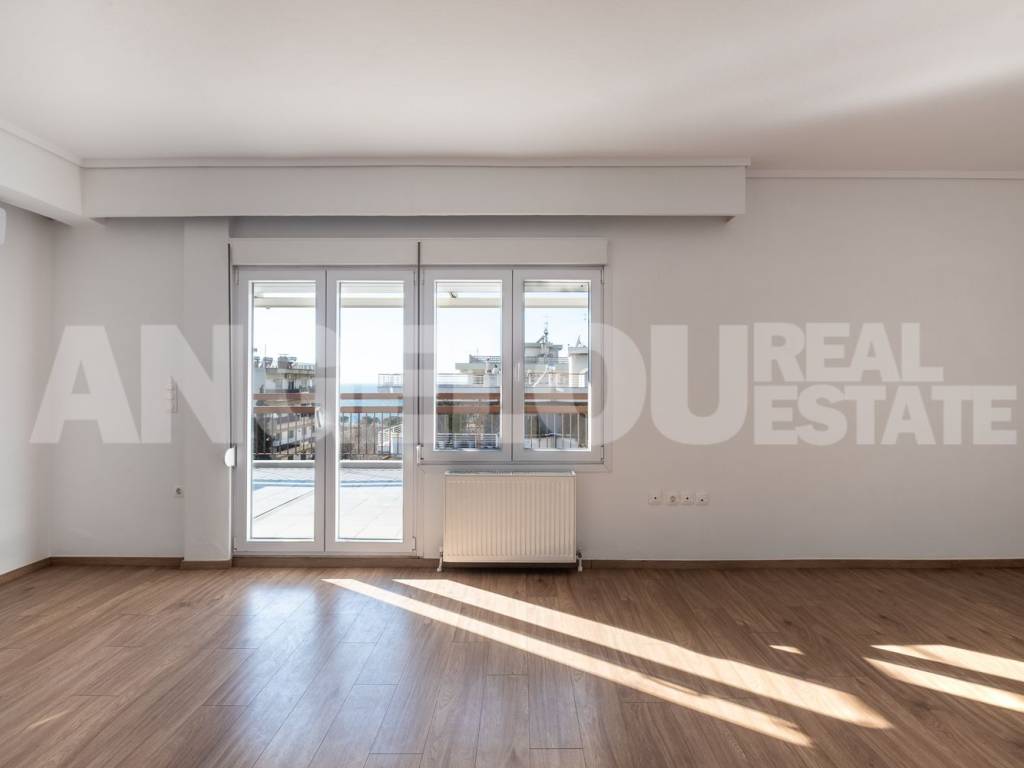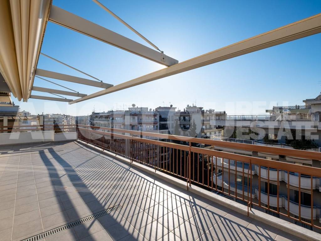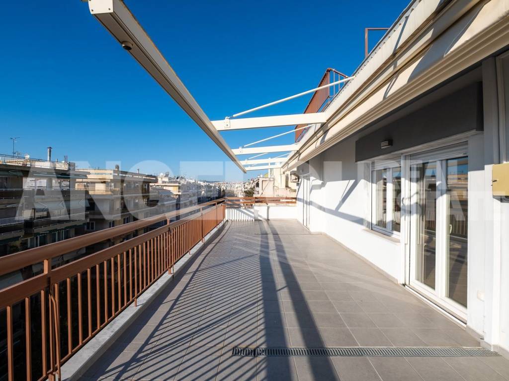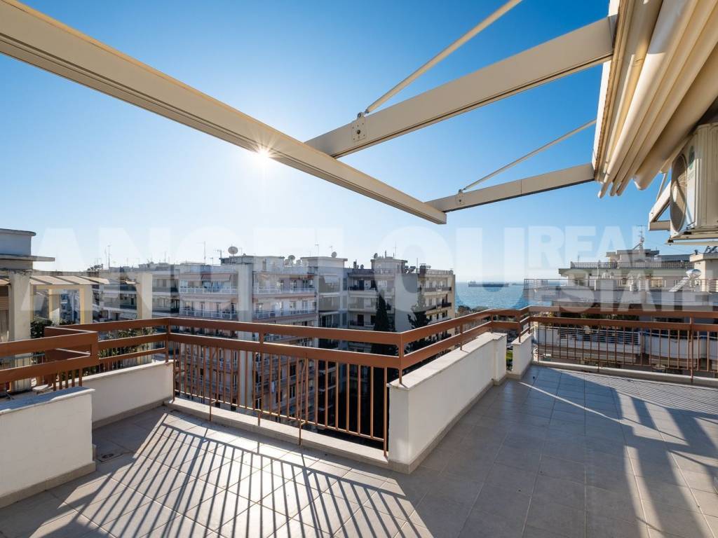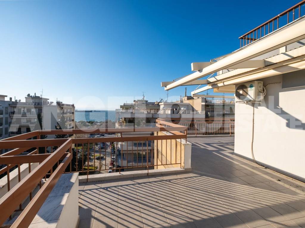 Thessaloniki, Faliro. Beautiful penthouse of 120 sq m with a sea view for rent. The apartment is located on the seventh floor of the building, it is fully renovated and very sunny. It has two large verandas with a total area of ​​100 sq m and amazing sea views. It consists of a large living room, separate kitchen, laundry room, two spacious bedrooms with wardrobes, additional wardrobes in the hallway, a bathroom with an enclosed shower and a half bathroom. An internal staircase leads to the third room which has access to its own veranda. The apartment has autonomous natural gas heating as well as four air conditioners. Both verandas have electric awnings with lighting. Property ID: 400 ANGELOU REAL ESTATE Tel.: +302310263215, +302310263775 Mob.: +306945385155 www.angelou-realestate.gr email: info@angelou-realestate.gr Mitropoleos 46-48, Thessaloniki, 54623, Greece
