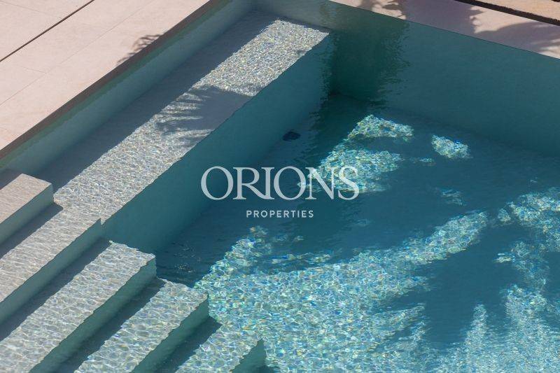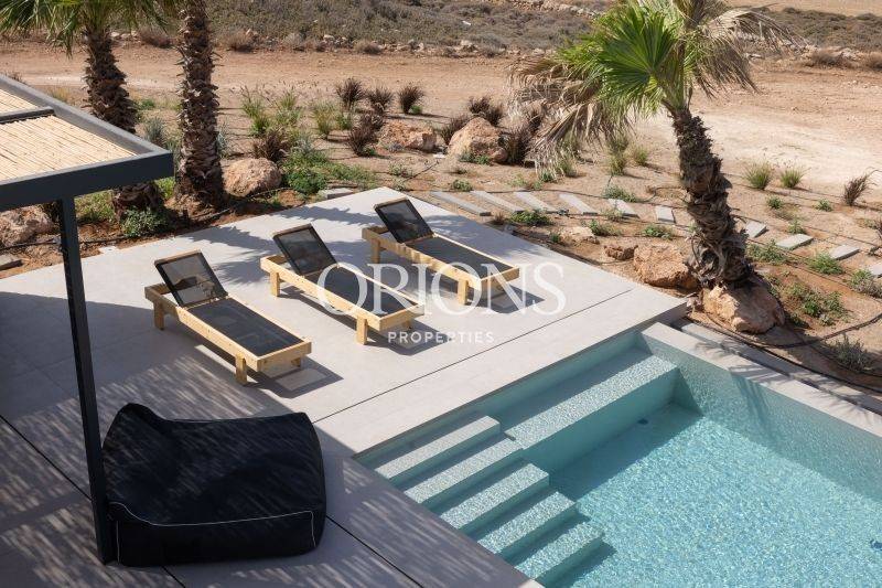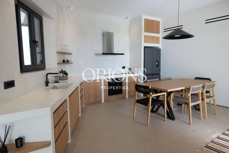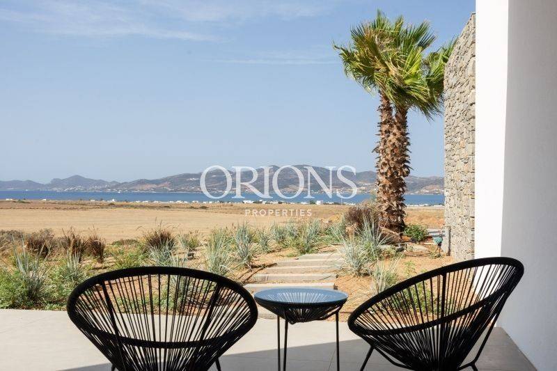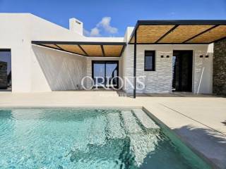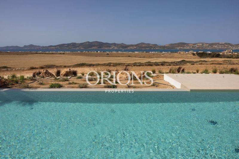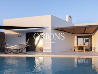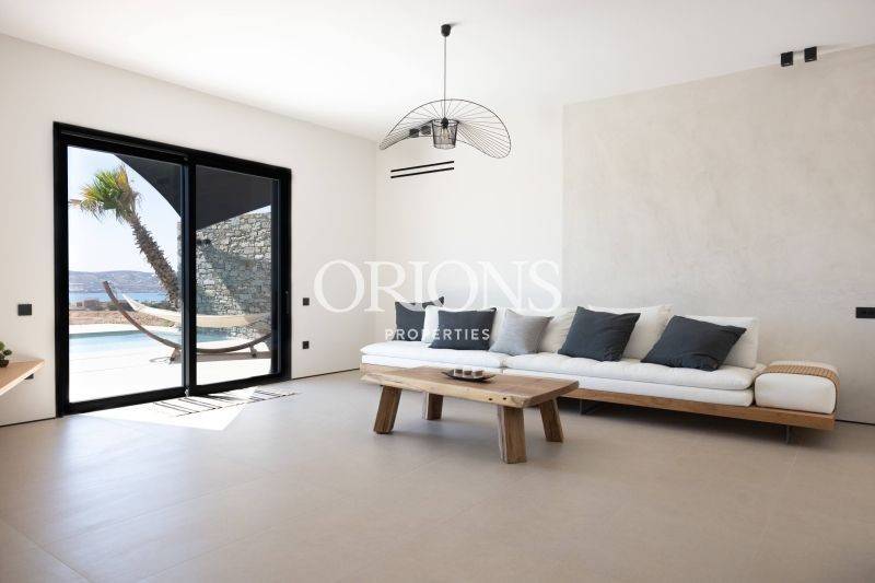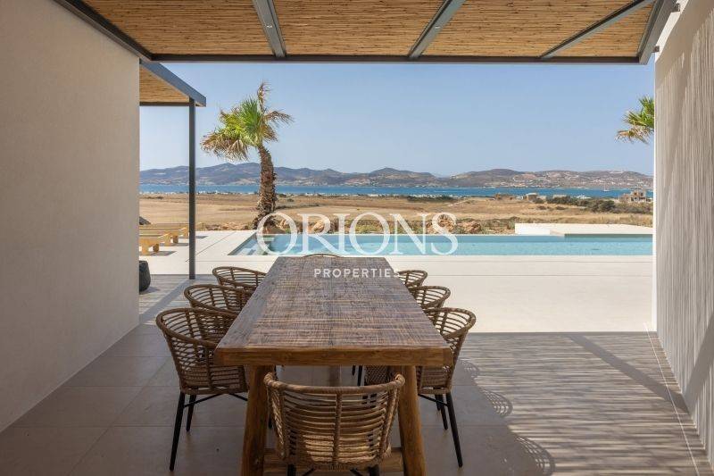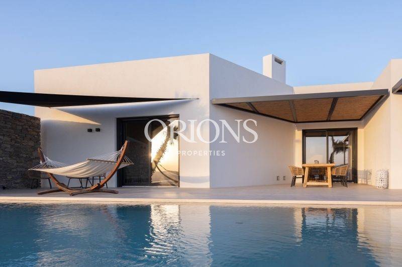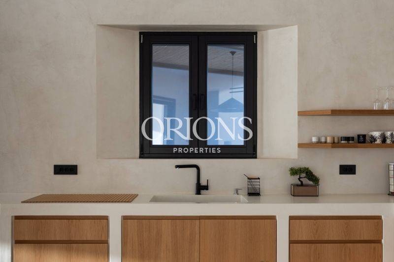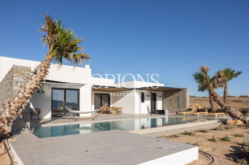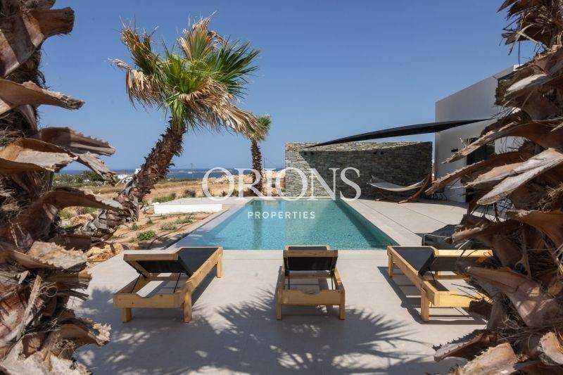 This villa is shaped by light, sea, and the slow rhythm of the southwest side of Paros.Designed on a single level and fully furnished, the living areas open effortlessly toward the horizon. From the living room, the view stretches wide across the sea, where sunsets arrive softly each evening and turn the sky into color. The atmosphere inside is calm and luminous, defined by minimalist architecture, modern expression, and simple lines that allow space and light to breathe.The villa offers 174 square meters of interior space, with three bedrooms, each with its own ensuite bathroom, along with a guest bathroom. The open plan living room creates a natural gathering point, while the kitchen is thoughtfully designed for preparing meals with ease and flow, supporting everyday moments and shared experiences.Outside, the garden feels open and deeply connected to the natural landscape around it. Palm trees rise naturally beside a water feature that brings movement, freshness, and the invitation for refreshing dips on warm days. The space flows outward, blending the villa seamlessly with its surroundings and the open sky.The rooftop defines another way of living. With a barbecue area and generous seating, it is designed for long summer evenings with friends and family, watching the sun sink into the sea as the light slowly fades and the island settles into night.The location brings the best of the island close by. Just minutes away, Punda fills the air with energy and movement, where kitesurfers glide across the water and the beach comes alive. Nearby Aliki offers a softer pace, with sandy beaches, traditional tavernas, and restaurants that invite you to stay, eat well, and enjoy the simple pleasures of island life.This is a home where modern design meets the landscape. Clean lines, openness, and light come together to create a villa that feels relaxed, balanced, and deeply connected to its surroundings.
