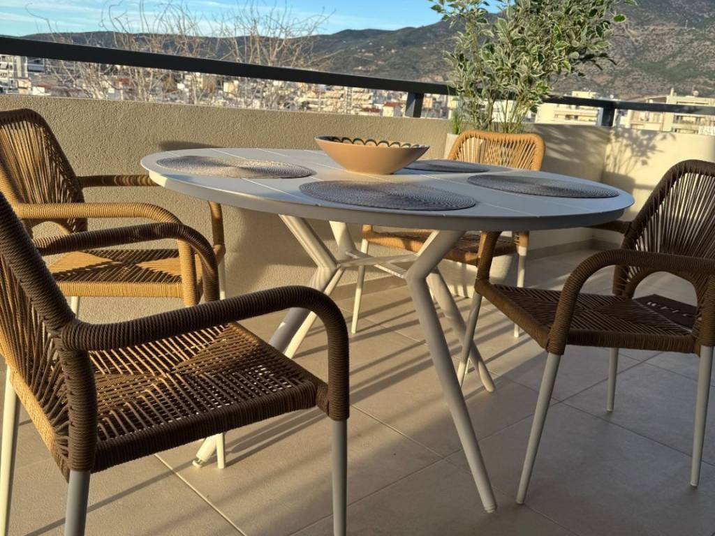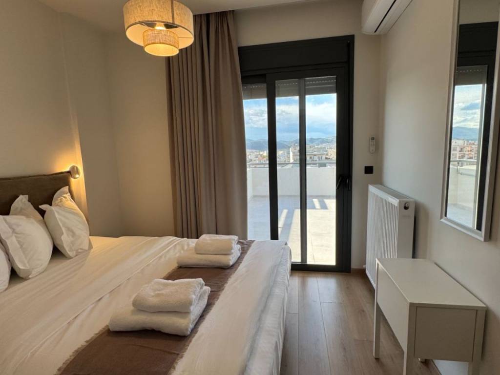 Unique newly built three bedroom penthouse apartment of high specifications located in a modern architectural building in a prime area of Volos The property stands out for its spacious wraparound balcony offering unobstructed panoramic views of Mount Pelion and the city of Volos creating a rare combination of natural beauty and urban living It includes a private storage room and an exclusive parking space accommodating up to two medium sized vehicles a highly sought after feature for penthouse properties within the city The apartment is delivered fully furnished and fully equipped with modern electrical appliances allowing immediate occupancy or high yield investment use with no additional costs Situated just six minutes from the city center of Volos and twenty minutes from Portaria it represents an ideal choice for discerning buyers seeking comfort quality and long term value either as a primary residence a holiday home or a premium investment property
