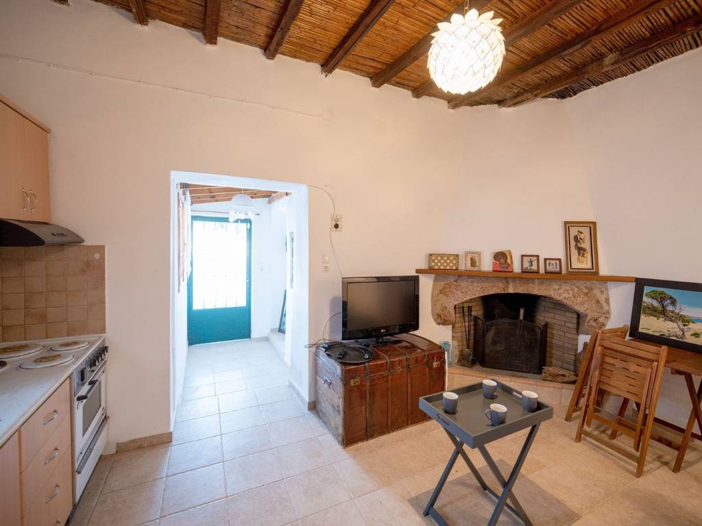 The apartment is located in a quiet neighborhood, 250 meters from the central square of Zakros. It features one bedroom with a double bed, a living room with a sofa bed and coffee table, a fully equipped kitchen, and a bathroom with a toilet, shower cabin, sink, and washing machine. The bedroom has a window facing the street and a ceiling fan. The living room includes a fireplace. The kitchen is equipped with a refrigerator and an oven. The apartment has a courtyard shared with the neighboring apartment, but it can easily be separated if needed. There is no designated parking space, but parking is available outside the house or very close to it. The walls are made of stone. The apartment is equipped with a solar water heater.