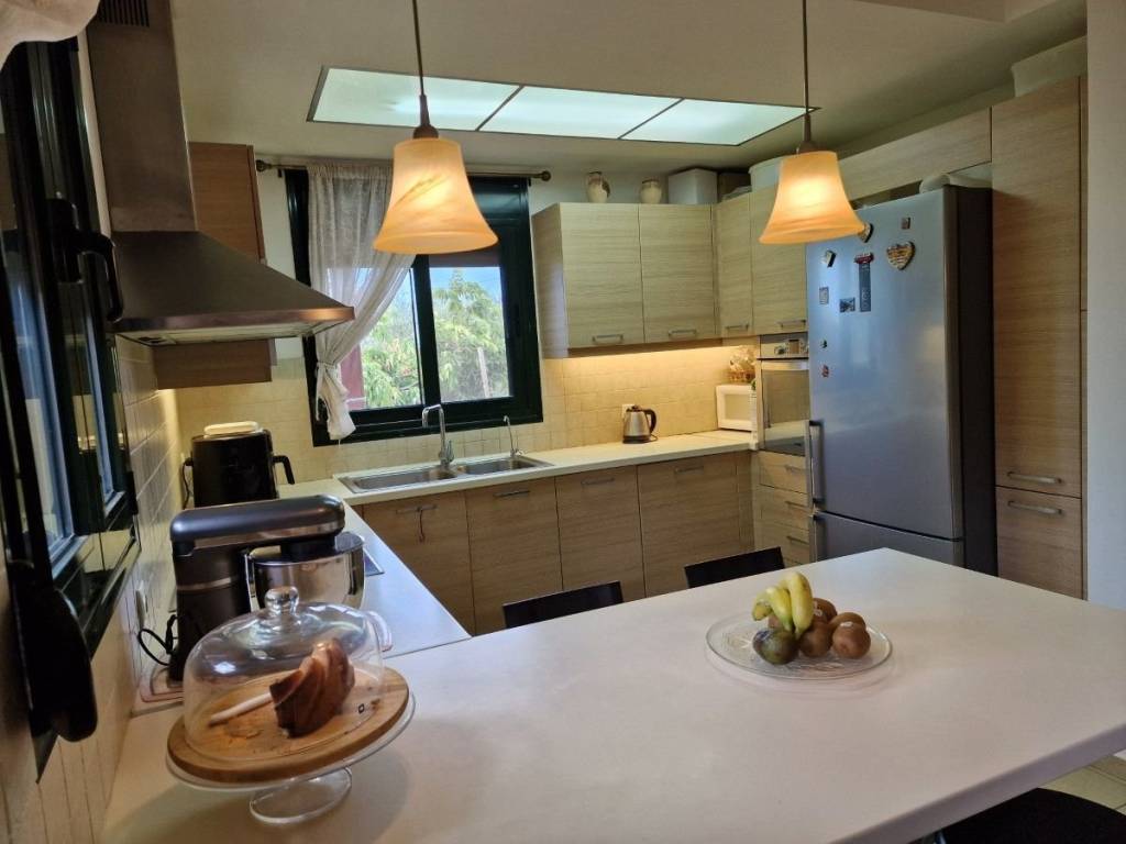 Large villa of about 178m2 is situated on a plot of about 322m2. It is situated at the fringe of the old town of Hersonissos, a traditional village with its cobbled streets and small shops and tavernas. 3 km from the International Golf Course. On the ground floor is a large living room with fireplace, which is connected with the central heating. There is an open-plan fitted kitchen, a dining area and a second lounge area. There are two airco-units. On the first floor is the master bedroom, plus two more double bedrooms and the bathroom. All bedrooms have fitted wardrobes and a private balcony. In the basement is an independent studio. The landscaped garden has several sitting areas and there is a space for a car to park. Lovely tiled throughout the house with all maintenance free doors and windows with (some are electric operated) shutters and mosquito gauze. With central heating.