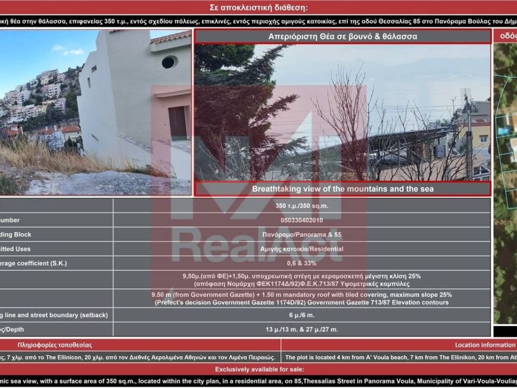 Exclusively available for sale: A plot of land with panoramic sea view, with a surface area of 350 sq.m., located within the city plan, in a residential area, on 85,Thessalias Street in Panorama Voula, Municipality of Vari-Voula-Vouliagmeni. Surface: 350 sqm. Cadastral unique number: 050330402010 Sector: Panorama Building Block: 55 Permitted Uses: Residential Building coefficient (S.D.) :0.6 Coverage coefficient (S.K.): 33% Max Height: 9.50 m (from Government Gazette) + 1.50 m mandatory roof with tiled covering, maximum slope 25% (Prefect's decision Government Gazette 1174D/92) Government Gazette 713/87 Elevation contours Distance between building line and street boundary (setback): 6 m. Frontage: 13 m. Depth: 27 m. The plot is located 4 km from A’ Voula beach, 7 km from The Ellinikon, 20 km from Athens International Airport and from the Port of Piraeus. Selling Price: €470,000.00. NAIRealAct, Τηλ: 2130299090, 6981006000, email: george.fantis@nairealact.com, website: www.nairealact.com