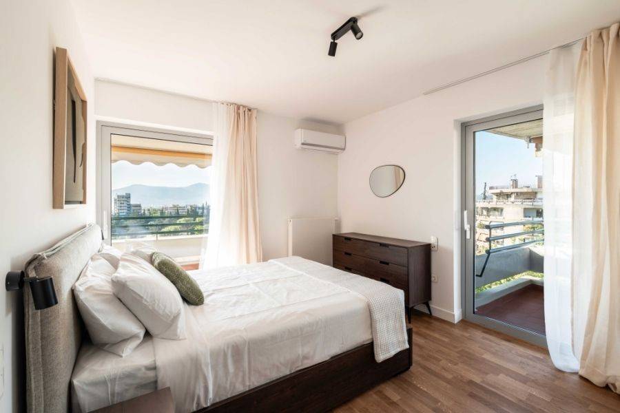 Kifissia, Zirineio, Apartment For Rent, 135 sq.m., Property Status: Amazing, Floor: 5th, 1 Level(s), 3 Bedrooms 1 Kitchen(s), 2 Bathroom(s), 1 WC, Heating: Autonomous - Natural Gas, View: Mountain View, Building Year: 1988, Energy Certificate: A, 1 parking(s), Floor type: Wooden floors + Tiles, Type of doors: Aluminum, Features: Elevator, Security door, Security alarm, CCTV, Fireplace, Night stream, Cable TV, Internet Line, Electric Appliances, Double Glazed Windows, Window Screens, Balcony Cover, Balconies, Furnished, Luxury, Penthouse, Airy, Roadside, Bright, On Corner, AirConditioning, Solar water system, Boiler, Painted, Renovated, Price: 2.850€. Yestayhomes, Tel: 6986749007