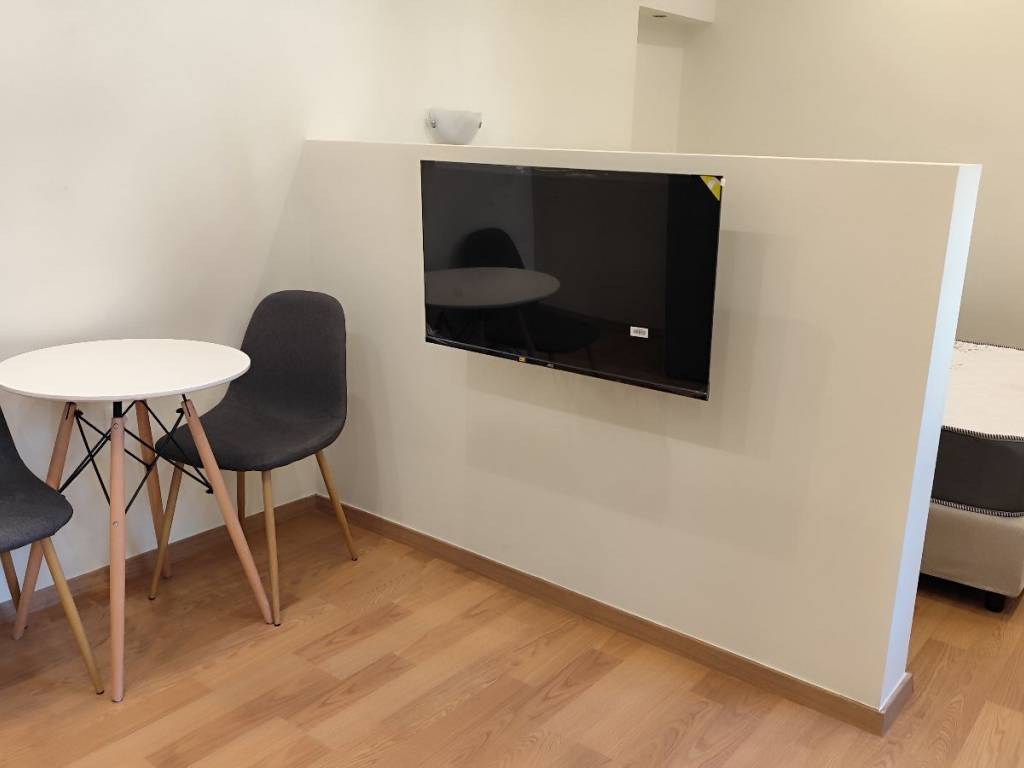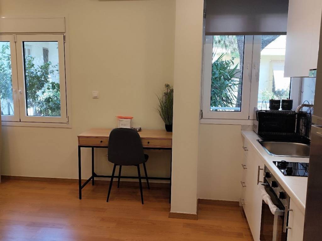 Ανακαινισμένο και επιπλωμένο studio με όλες τις ηλεκτρικες συσκευες. Διαθέτει διπλό κρεβάτι με στρώμα, κομοδίνα, ντουλάπα, κλινοσκεπάσματα, κουζινικά είδη, γραφείο, τραπέζι, καρέκλες, κλιματιστικό, πλυντήριο ρούχων, ψυγείο, τηλεόραση, φούρνο, εστίες, φούρνο μικροκυμάτων, καφετιέρα,