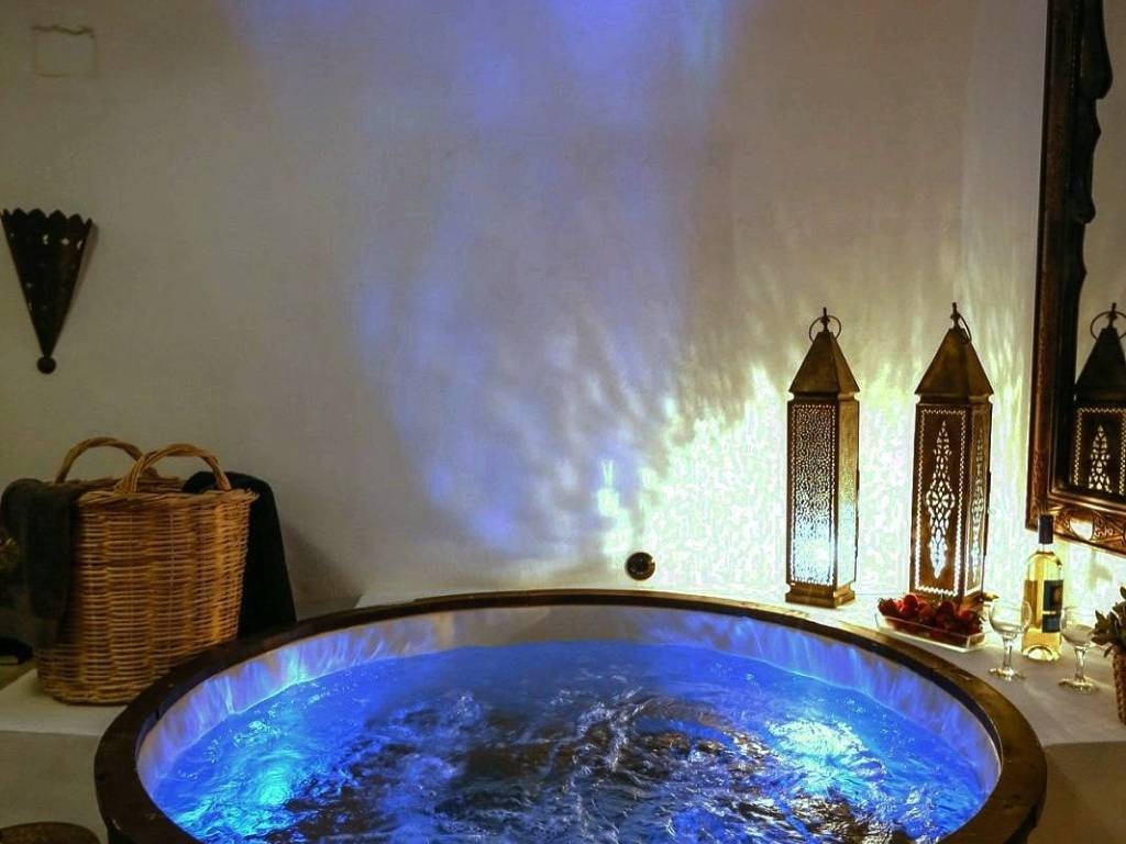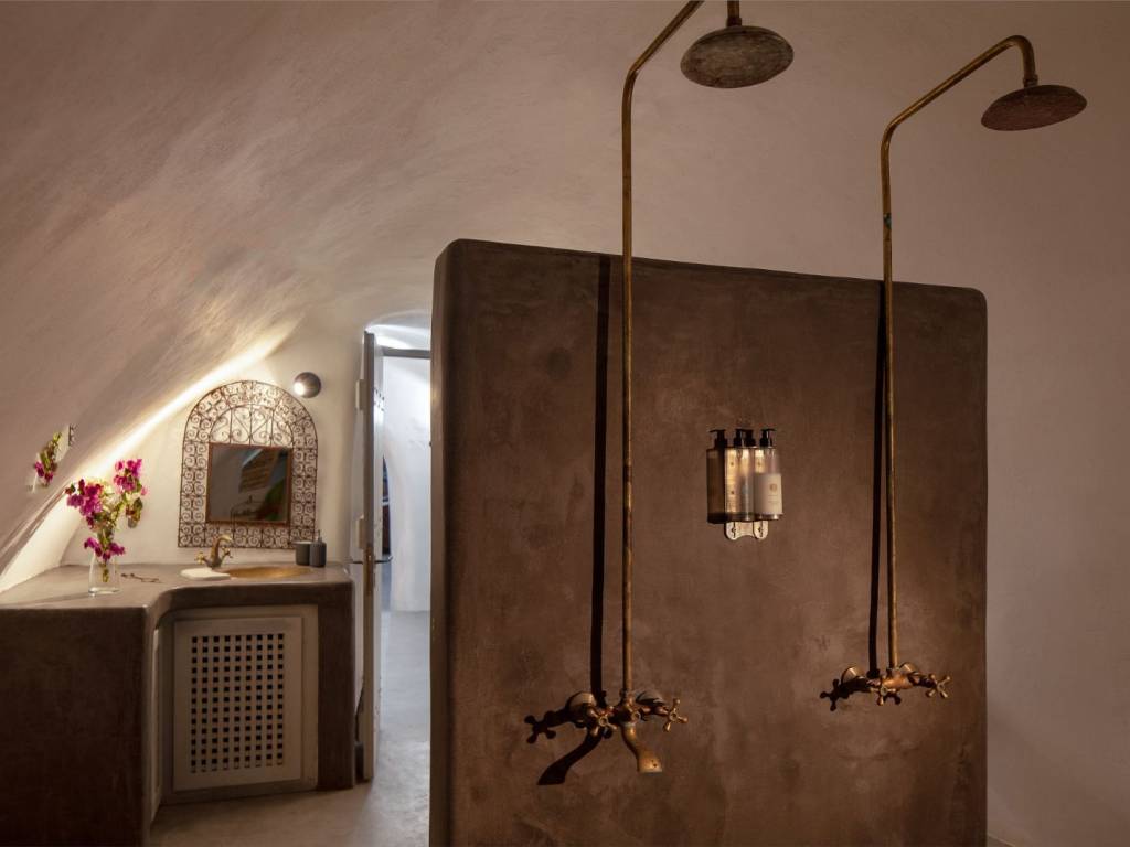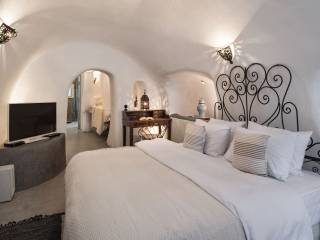 It is a traditional Cycladic villa with 3 separate, adjacent caves, in a private, fenced courtyard and a wonderful waterfall – jacuzzi. This is also a “cavity” – half is inside a rock in the ground and the other half is visible at the same level as the courtyard. It is clearly the highlight of the courtyard. Also, in the same area of the courtyard there are a large table with chairs, two large wooden benches, a coffee table and chairs. The villa is 147 sq m. which means comfort and luxury. As we described above, there are 3 different caves in the series, one on the surface of the courtyard, the other a little lower, which are 42 sq m., 23 sq m. and 85 sq m. each. A special case of a house with picturesque, traditional, authentic architectural elements. Let us take you on a mental tour of the first cave: in front of you is a fully equipped kitchen, a cozy corner with a corner sofa - double bed and coffee tables. In the same space there is a minimal bathroom with a shower. And here we will surprise you: a sensual, Moroccan corner in which there is a heated hydromassage barrel - hot tub! And we move on to the second cave (23 sq m) where there is a bedroom with a double bed and a gold-painted bathroom with thick ropes falling as a curtain instead of a door. This space can accommodate up to 2 people. And we come to the third cave, (85 sq m), which has a Moroccan-style bedroom with a super double bed, a small kitchenette, a secondary open space bedroom with a double mattress (1.40m x 2.00m), a super huge & exceptional bathroom with two shower seats.