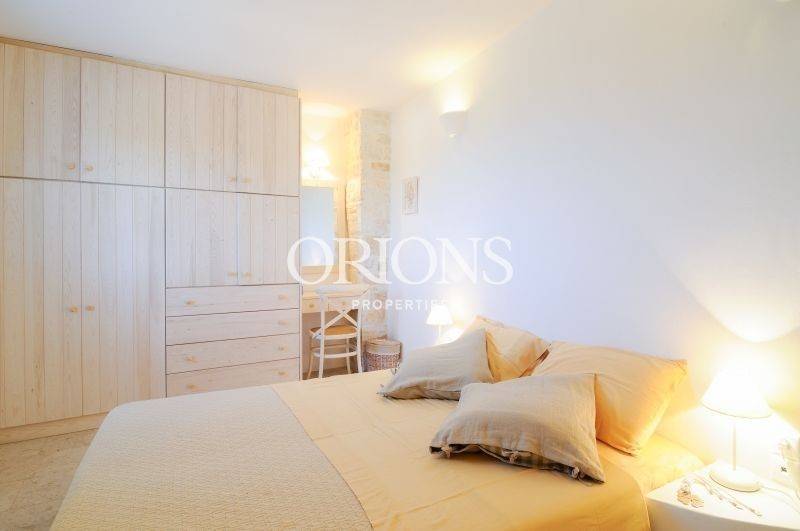 The lower level hosts a guest house with three master bedrooms, each with its own bathroom, along with a living area and fitted kitchenette. All rooms open directly to a paved courtyard and a landscaped garden with aromatic plants and open views. The upper level is the main house, featuring a spacious living room with a fireplace, dining area, fully equipped kitchen, guest WC, and an additional master bedroom, all opening to the main courtyard and swimming pool.