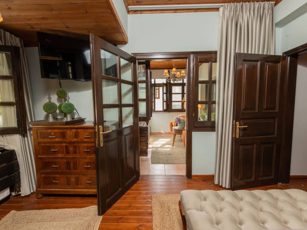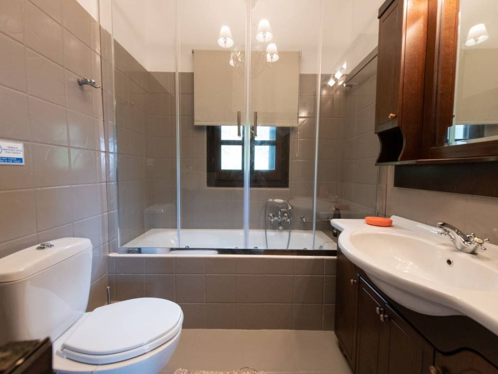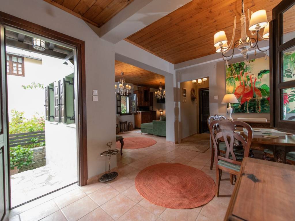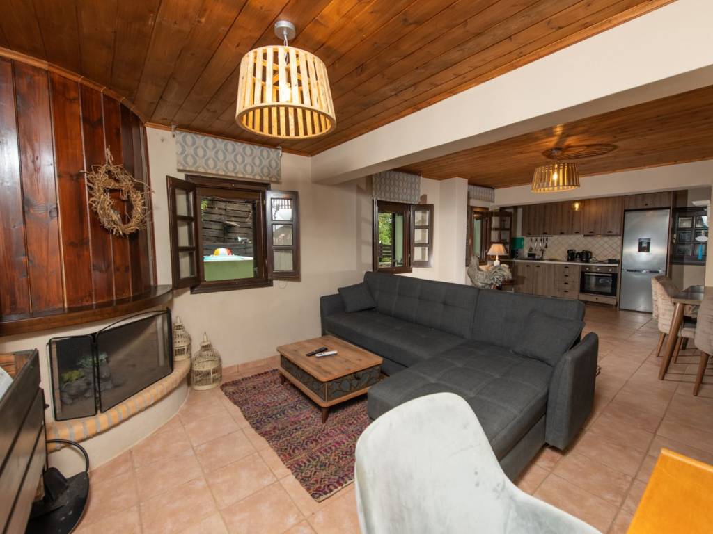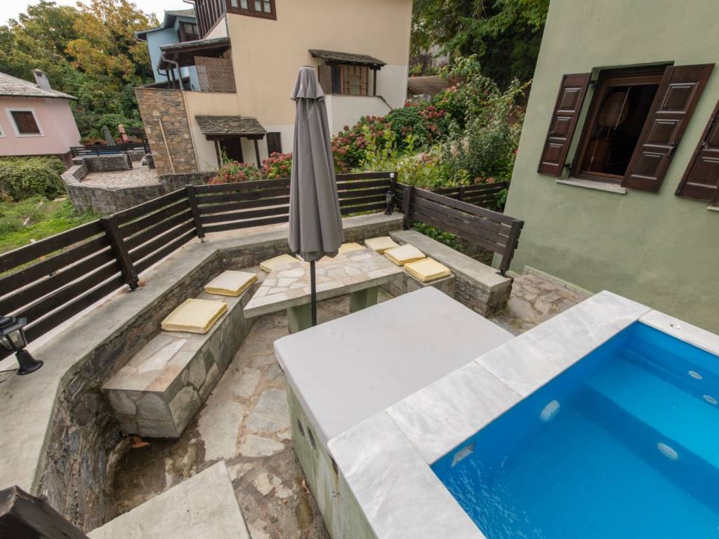 ΠΡΑΣΙΝΟ Το σπίτι βρίσκεται στον παραδοσιακό οικισμό της Αγίας Παρασκευής, μόλις 2 λεπτά με τα πόδια από την πλατεία του οικισμού με τον χαρακτηριστικό τεράστιο πλάτανο των 13 αιώνων. Αποτελείται από δύο σπίτια με ξεχωριστές εισόδους το καθένα. Μπαίνοντας στο πρώτο σπίτι θα συναντήσετε ένα ενιαίο χώρο όπου βρίσκεται το σαλόνι με το τζάκι, η τραπεζαρία, ένα γραφείο για “business and pleasure”, μία πλήρως εξοπλισμένη κουζίνα και ένας γωνιακός καναπές-κρεβάτι όπου μπορούν να κοιμηθούν 2 άτομα. Επίσης, υπάρχει ένα τεράστιο δωμάτιο, όπου πολύ άνετα χωρούν το διπλό κρεβάτι, μια ντουλάπα από τοίχο σε τοίχο, ένας επιδαπέδιος καθρέφτης αντίκα και το μπάνιο με μπανιέρα. Στον εξωτερικό χώρο υπάρχει πισίνα, χτιστό τραπέζι και πάγκος. Μπαίνοντας στο δεύτερο σπίτι θα συναντήσετε το σαλόνι όπου υπάρχει ένας γωνιακός καναπές – κρεβάτι, το τζάκι και η τραπεζαρία. Στον ίδιο χώρο θα βρείτε και ένα κλασικό πιάνο. Στη συνέχεια θα συναντήσετε ένα δωμάτιο με ένα μονό κρεβάτι το οποίο ανοίγει στο κάτω μέρος κι έτσι μπορούν να κοιμηθούν μέχρι 2 άτομα. Τέλος, στον ίδιο όροφο υπάρχει μία πλήρως εξοπλισμένη κουζίνα και ένα μικρό WC. Συνεχίζοντας, στον επάνω όροφο υπάρχουν δύο όμορφα διακοσμημένα δωμάτια, οι κύριες κρεβατοκάμαρες του σπιτιού, ήσυχες, φτιαγμένες με ρομαντική διάθεση με 1 διπλό κρεβάτι η καθεμιά. Η μία εκ των δύο έχει μπαλκονόπορτα που καταλήγει σε δικό της ιδιωτικό μπαλκόνι με τραπέζι και καρέκλες εξωτερικού χώρου για να αγναντεύετε τη θάλασσα. Στο χωλ τώρα υπάρχει μια δίφυλλη ντουλάπα κι ένα μεγάλο μπάνιο με μπανιέρα. Η επικοινωνία των ορόφων γίνεται μέσω ξύλινης σκάλας. Από τα ωραιότερα δωμάτια του σπιτιού είναι το αίθριο, ένας καθιστικός χώρος ανάμεσα στις δυο κρεβατοκάμαρες του πάνω ορόφου με απαράμιλλη θέα – θάλασσα, με γύρω γύρω τζαμαρίες. Τέλος, στις αυλές των σπιτιών υπάρχουν ένα τζακούζι (2×2.5m.) και μια μικρή πισινά (2x3m.) για 4 άτομα το καθένα Στην υπόλοιπη αυλή υπάρχουν χτιστά έπιπλα κήπου για να ξαπλώσετε.