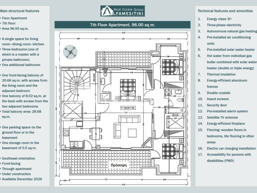 Under Construction Floor Apartment 96 sq.m. on the 7th floor in Nea Smyrni A 96.00 sq.m. under-construction floor apartment is available for sale on the 7th floor of a luxurious seven-story residential building of energy class B+ in Nea Smyrni. Layout The apartment is facade-facing, airy, bright, with exceptional lighting and a southeast orientation. It includes a unified living-dining-kitchen area, three bedrooms (one of which is a master with a private bathroom), an additional bathroom, a large front-facing balcony of 20.66 sq.m. accessible from the living room and bedroom, a rear balcony of 8.02 sq.m. accessible from the other two bedrooms, one basement or Pilotis parking space, and a 5.5 sq.m. basement storage. Residence Features Three-phase electricity, autonomous natural gas heating, pre-installation for air conditioning, pre-installation for a solar water heater, hot water from an individual gas boiler in combination with a solar water heater (double or triple energy), thermal facade, energy-efficient aluminum frames, screens, security door, alarm pre-installation, satellite TV antenna, energy fireplace, floors: wood in bedrooms, tile in other areas, electric car charging installation, one parking space on the ground floor or basement, one basement storage room, access for disabled persons. Location This residence combines modern comforts and luxury construction with tranquility and quality living in a quiet area, making it an ideal choice for families ► For more details about the property, the building or the area as well as to visit the property you can visit the page - https://www.alfamesitiki.gr/pdetails?id=Α-146247&lng=en ► For opportunities in similar properties and in other areas visit our page at alfamesitiki.gr ► Last update 26/1/2026 ► Follow us on Facebook www.facebook.com/alfamesitiki.gr