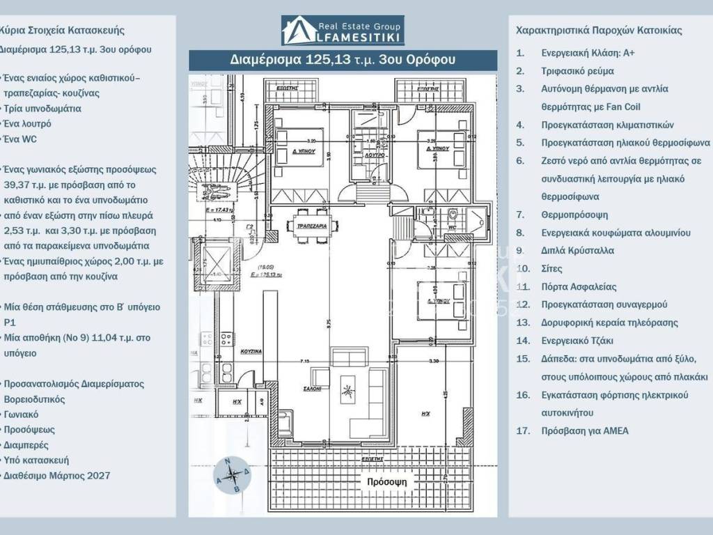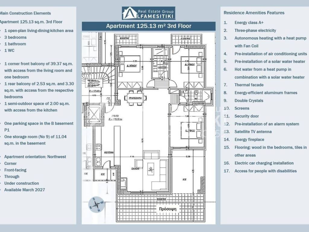 An under-construction apartment of 125.13 m² on the 3rd floor of a luxurious six-story residential building, energy class A+, is available for sale in Alimos. Layout The apartment is front-facing, through, airy, sunny, with exceptional brightness and northwest orientation. It includes a single space for living-dining-kitchen, three bedrooms, one bathroom, one WC, a corner front-facing balcony of 39.37 m² accessible from the living area and one bedroom, a rear balcony of 2.53 m² and 3.30 m² accessible from the respective bedrooms, a semi-outdoor space of 2.00 m² accessible from the kitchen, one parking space (No P1) in the second basement, and a storage room (No 9) of 11.04 m² in the basement. Features Three-phase electricity, autonomous heating with heat pump and fan coil, pre-installation of air conditioning units, pre-installation of a solar water heater, hot water from a heat pump in combination with a solar water heater, thermal façade, energy-efficient aluminum frames, double crystals, screens, security door, pre-installation of an alarm system, satellite TV antenna, energy-efficient fireplace, floors: wood in the bedrooms, tiles in the other areas, electric car charging installation, access for people with disabilities. Location The residence is located in a spot that combines the tranquility of a good and quiet area with proximity to Poseidonos Avenue. It offers easy access to the center of Athens, Piraeus, and the Athenian Riviera, making it a good choice for families and professionals. ► For more details about the property, the building or the area as well as to visit the property you can visit the page - https://www.alfamesitiki.gr/pdetails?id=Α-146234&lng=en ► For opportunities in similar properties and in other areas visit our page at alfamesitiki.gr ► Last update 23/1/2026 ► Follow us on Facebook www.facebook.com/alfamesitiki.gr