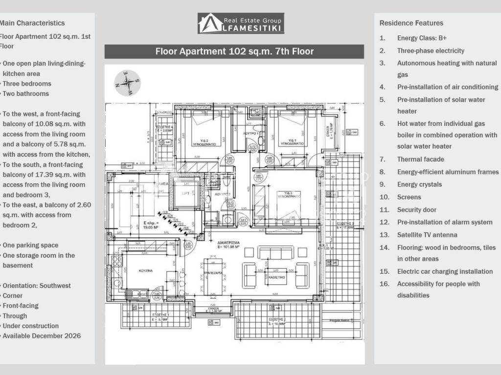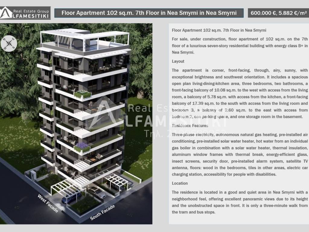 For sale, under construction, floor apartment of 102 sq.m. on the 7th floor of a luxurious seven-story residential building with energy class B+ in Nea Smyrni. Layout The apartment is corner, front-facing, through, airy, sunny, with exceptional brightness and southwest orientation. It includes a spacious open plan living-dining-kitchen area, three bedrooms, two bathrooms, a front-facing balcony of 10.08 sq.m. to the west with access from the living room, a balcony of 5.78 sq.m. with access from the kitchen, a front-facing balcony of 17.39 sq.m. to the south with access from the living room and bedroom 3, a balcony of 2.60 sq.m. to the east with access from bedroom 2, one parking space, and one storage room in the basement. Residence Features Three-phase electricity, autonomous natural gas heating, pre-installed air conditioning, pre-installed solar water heater, hot water from an individual gas boiler in combination with a solar water heater, thermal insulation, aluminum window frames with thermal break, energy-efficient glass, insect screens, security door, pre-installed alarm system, satellite TV antenna, floors: wood in the bedrooms, tiles in other areas, electric car charging station, accessibility for people with disabilities. Location The residence is located in a good and quiet area in Nea Smyrni with a neighborhood feel, offering excellent panoramic views due to its height and the unobstructed space in front. It is only a three-minute walk from the tram and bus stops. ► For more details about the property, the building or the area as well as to visit the property you can visit the page - https://www.alfamesitiki.gr/pdetails?id=Α-146230&lng=en ► For opportunities in similar properties and in other areas visit our page at alfamesitiki.gr ► Last update 26/1/2026 ► Follow us on Facebook www.facebook.com/alfamesitiki.gr