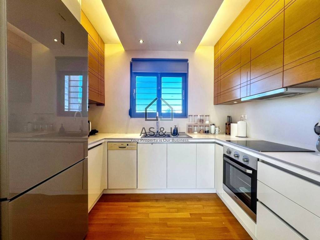 All areas, except for the basement, feature oak wood flooring, as does the internal staircase that connects all levels up to the rooftop. The remaining floors and bathrooms are finished with high-quality tiles. It is equipped with many and big built-in wardrobes.