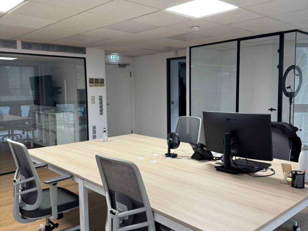 4 dedicated desks for rent in office space, separately or all together. Prime location in Kifisias Avenue. Price €230 per month per workstation. The space was fully renovated in 2025 and includes access to a shared meeting room and soundproof booth. Option to use as registered business address. Rent includes electricity, common charges, water, and fiber internet of 1000Mbps. Parking available upon arrangement.