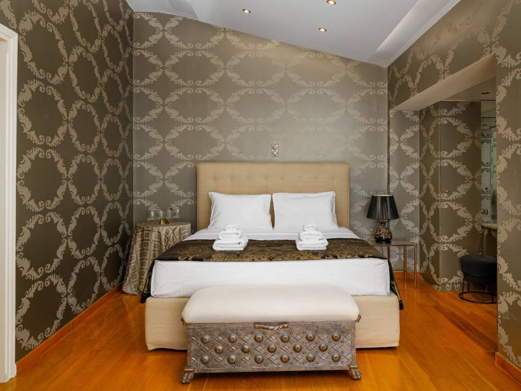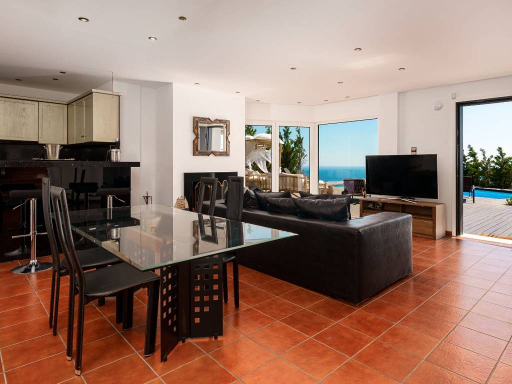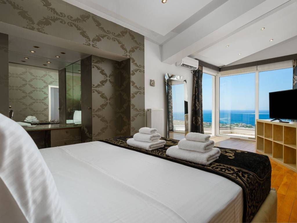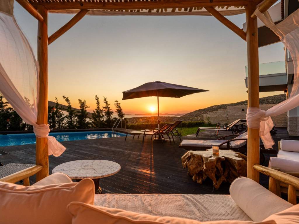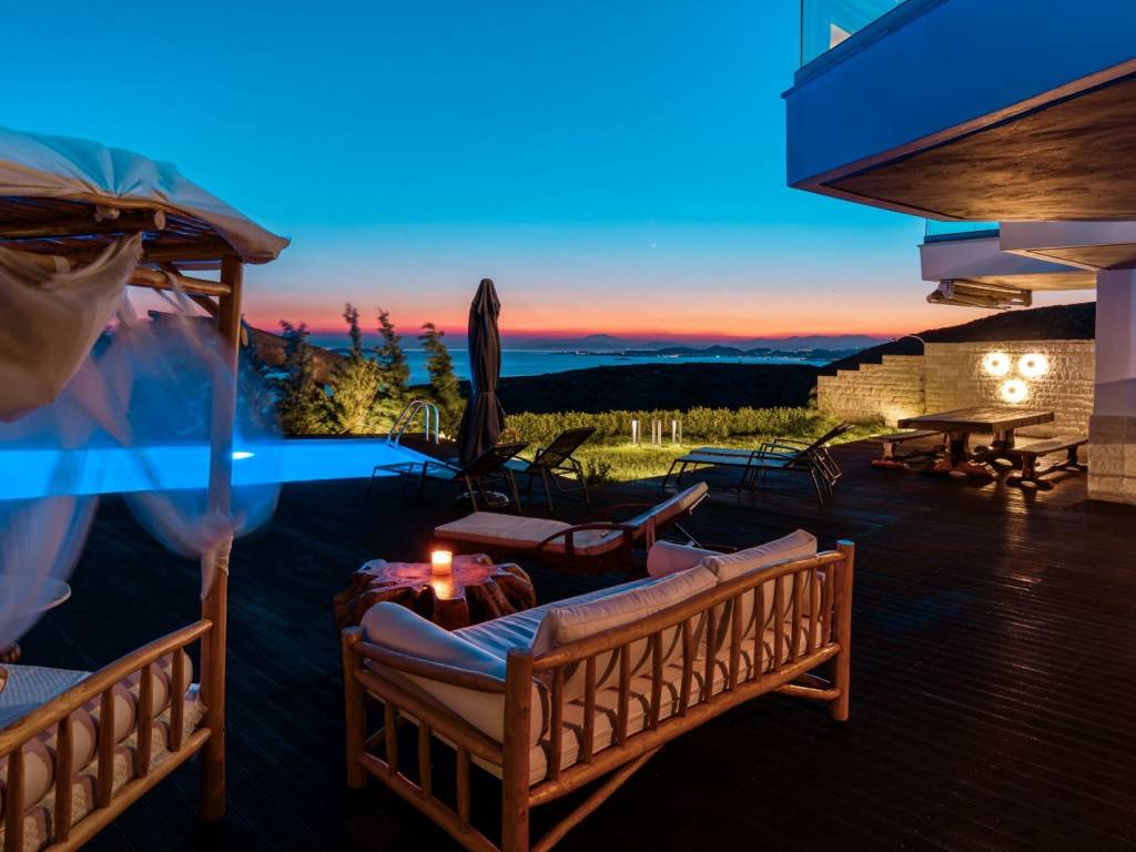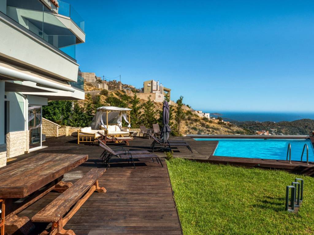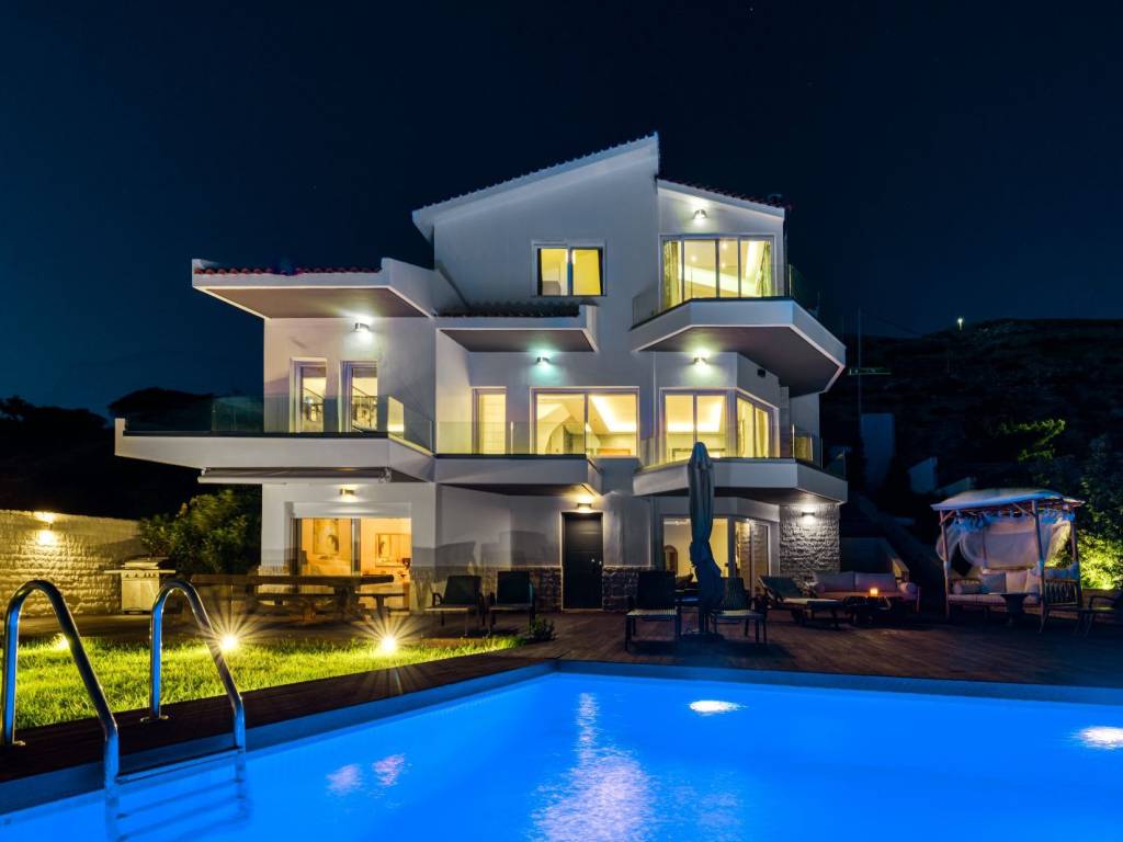 Available for long-term rent: an impressive three-story villa in Saronida, set in a quiet hillside location with uninterrupted panoramic views of the Aegean Sea and stunning sunsets. A private retreat combining comfort, privacy, and spaces ideal for a family, friends, or remote work. • 4 bedrooms, 2 bathrooms, and 1 guest WC • Private swimming pool approx. 60 sq.m. • Large wooden terrace approx. 180 sq.m. with sun loungers, daybed, lounge area, outdoor shower, and atmospheric lighting • BBQ and spacious outdoor dining area for summer meals • 2 fully equipped kitchens • 4 inverter A/C units • Laundry area Layout • Ground floor: sea-view bedroom, full bathroom, kitchen, living room, laundry area • 1st floor: bedroom, guest WC, large kitchen, spacious living room, office, balconies • 2nd floor: 2 bedrooms, elegant bathroom with a large bathtub