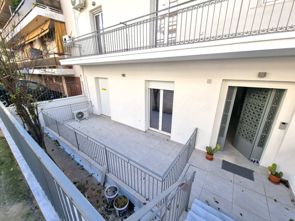 Ampelokipi - Fully renovated ground floor apartment of 75 sq.m. (in a duplex). It is front-facing, airy and consists of 1 bedroom, large living room, kitchen and bathroom. It has 2 air conditions, aluminum frames and new tiles.Large verandas. No shared utilities. Near to Panormou metro station.