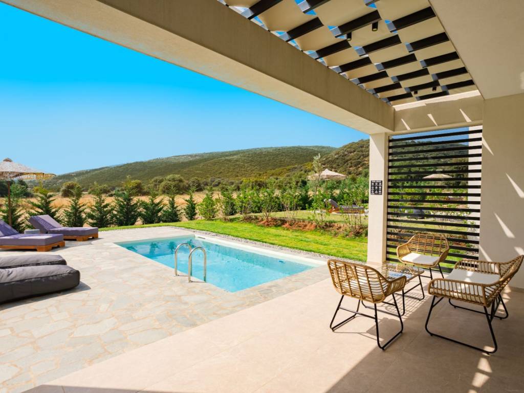 Διατίθεται προς ενοικίαση πολυτελής βίλα με δύο υπνοδωμάτια, μπάνιο , σαλόνι και κουζίνα. Διαθέτει ενδοδαπέδια θέρμανση, κλιματισμό και ενεργειακό τζάκι. Είναι πλήρως επιπλωμένο και με όλες τις ηλεκτρικές συσκευές. Έχει ιδιωτική πισίνα , πάρκινγκ , κήπο και αυλή. Στην τιμή συμπεριλαμβάνεται : ρεύμα, νερό, ίντερνετ, netflix , συντήρηση πισίνας και εξωτερικού χώρου καθώς και η καθαριότητα της οικίας.
