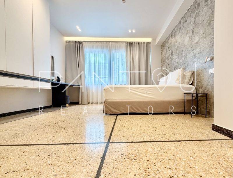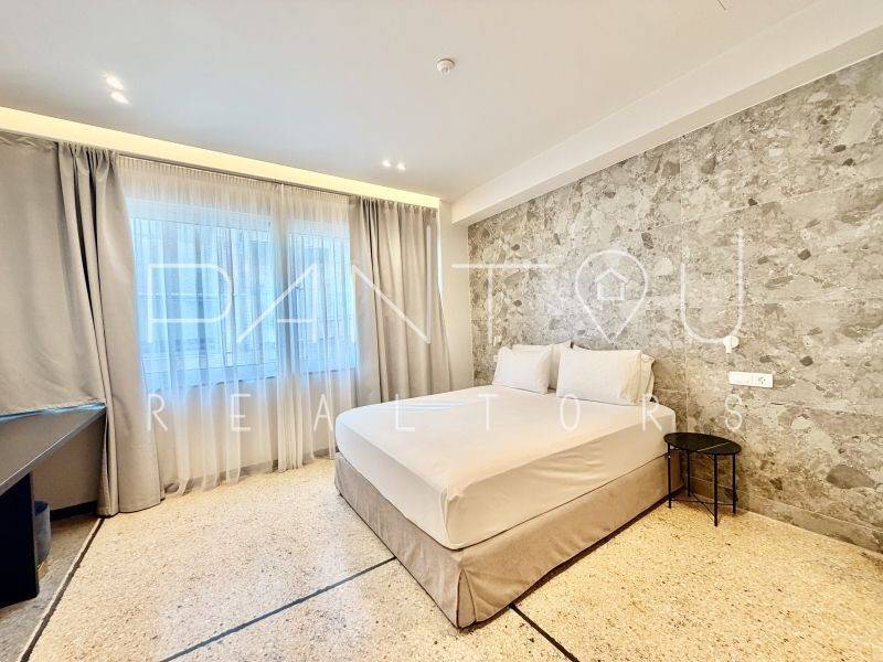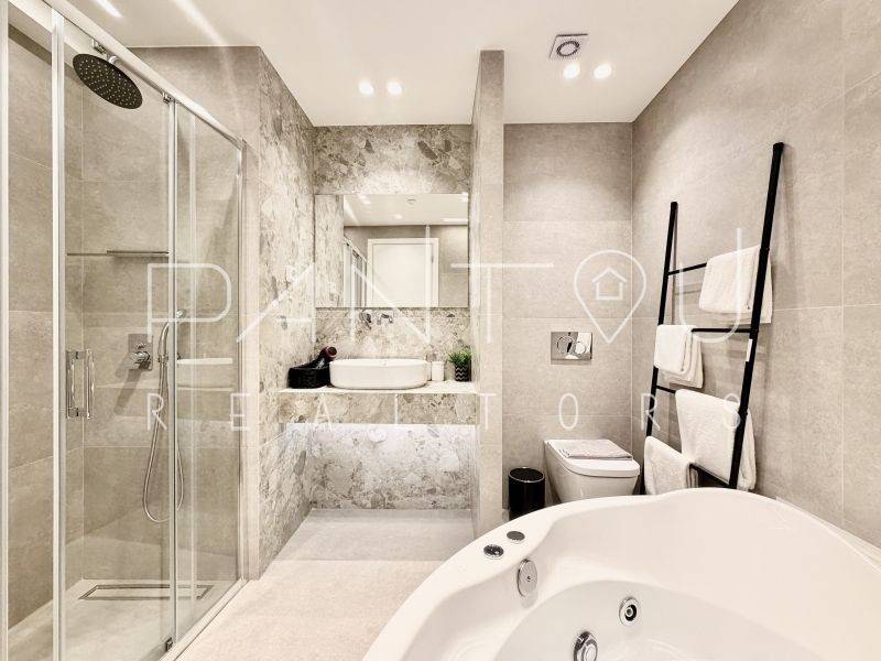 The bathroom operates as a private wellness corner: Glass shower cabin Jacuzzi bathtubWooden floor-standing ladder/towel rail Boutique lighting and clean lines.Comfort & Technology:Daikin Inverter A++ / A+ (R-32) for cooling and heating — silent, with air filters Thermally broken ALUMIL frames with double glazing Security door and cameras Polished mosaic and tile flooring Storage room LiftLocation