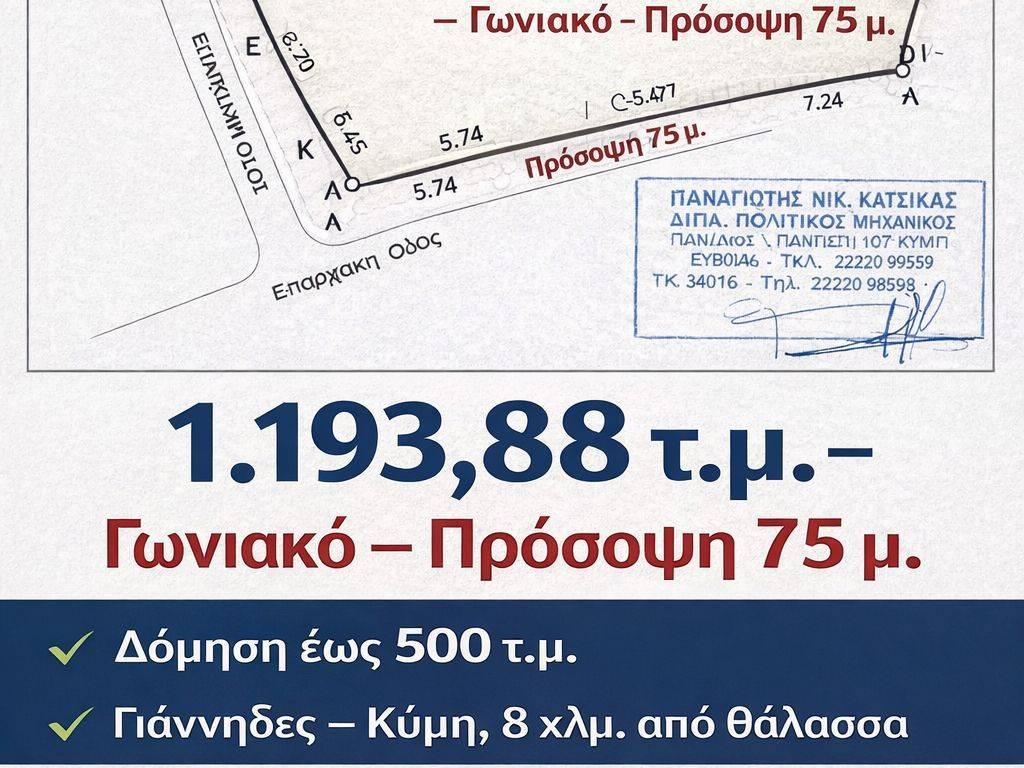 Corner Plot for Sale – 1,193.88 sq.m. Within Town Plan – Taxiarches, Kymi A buildable corner plot of 1,193.88 sq.m. is available for sale, located within the town plan in the settlement of Taxiarches (Giannides), Municipality of Kymi–Aliveri. Prime Location The property features an approx. 75-meter frontage on a provincial road, offering direct and easy access. Its corner position provides flexibility in design and excellent development potential. Building Capacity The plot comes with an approved topographic diagram and established building terms, allowing for construction of up to 500 sq.m. Ideal for: Permanent or holiday residence Development of multiple homes Investment or tourism use Close to the Sea Located just 8 km from Platana Beach, combining mountain and sea within a short distance. Suitable for private buyers and investors Price negotiable