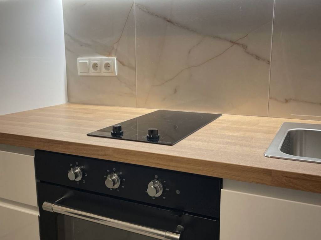 The apartment features a spacious bedroom, a well-appointed kitchen, an inviting living room, and a stylish bathroom, all designed to provide maximum comfort and privacy. Originally built in 1975, the property has been thoughtfully upgraded with high-quality aluminum frames and is classified under energy class A, ensuring energy efficiency and sustainability.