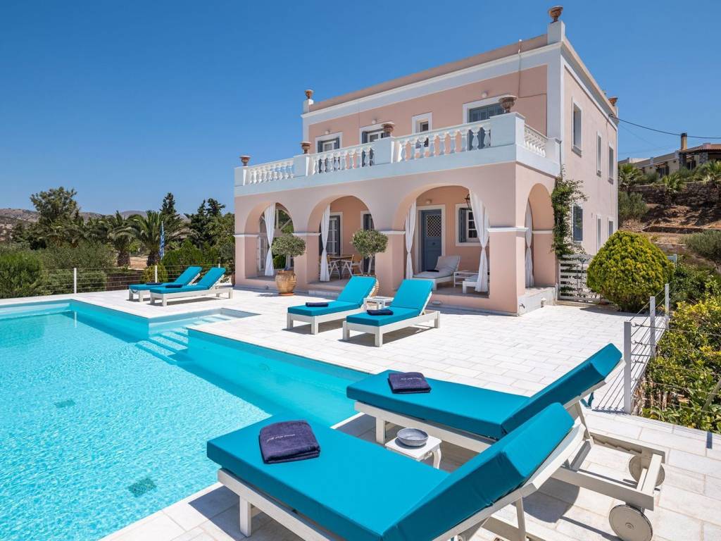 Solaria — Α private Syrian estate defined by vineyards, olive trees and panorama. Nestled in the tranquil Fourlaki area of Syros, this 262 sqm villa sits on a sprawling 4.5-acre plot, offering unmatched privacy, breathtaking Aegean views, and a rare sense of freedom. Designed with meticulous attention to detail, this neoclassical residence combines clean architectural lines with premium materials, seamlessly connecting indoor and outdoor spaces. The main floor features a spacious living area with fireplace, dining room, and kitchen, opening directly onto a 58 sqm swimming pool surrounded by sun-soaked terraces. The first floor hosts two master bedrooms and a private office with uninterrupted views to Serifos island, while a fully equipped guesthouse of 35sq.m. with a master bedroom and kitchenette ensures additional comfort and privacy. Plus in the basement one more bedroom lighted naturally with its own bathroom can assist your guests. The lush garden, with 69 olive trees and 20 fruit trees, delivers its own produce for the most discerning palate. A rare property, perfect as a luxury retreat or high-end investment, offering not just a home, but a true Aegean lifestyle. Syros, the heart of the Cyclades, is a premier destination for discerning buyers seeking both elegance and authenticity. Renowned for its cosmopolitan capital, Ermoupoli, the island boasts neoclassical mansions, marble squares, and sophisticated architecture influenced by Western Europe, reflecting its rich 19th-century heritage. Beyond the city, charming hillside villages and secluded coastal retreats offer privacy, panoramic Aegean views, and the tranquility of island living. The island combines cultural vibrancy with modern infrastructure, hosting world-class festivals, fine dining experiences, and boutique shopping, while maintaining its traditional Cycladic charm. With enduring investment potential and properties ranging from historic residences to contemporary villas, Syros offers an exclusive opportunity for high-end buyers to own a piece of Aegean luxury, blending timeless elegance, lifestyle, and heritage. Von Poll Greece offers a full spectrum of services to support clients throughout the property purchase process in Greece. Beyond our core real estate expertise, we collaborate with a trusted network of professionals—including legal advisors, notaries, tax consultants, and architects—to ensure every stage of the transaction is handled smoothly and securely. We guide buyers step-by-step through the entire process of acquiring property in Greece, from the initial search and due diligence to contract signing, taxation matters, and final handover. Our goal is to provide a transparent, efficient, and fully supported experience for international and local clients alike.