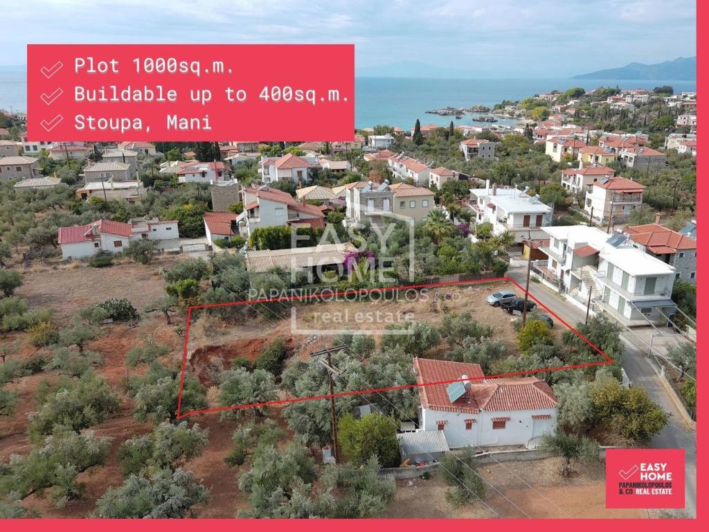 Plot of 1,000 sq.m. in the tourist destination of Stoupa, Mani This wonderful plot is located within the settlement, very close to the beach, and has a building allowance of up to 400 sq.m. for one or more residences, on one or two levels. It is ideal for a vacation home or permanent residence, as well as a tourist business. A design is available for the construction of four two-story tourist residences with swimming pools. The technical specifications of the plot are as follows: 23 m frontage, 40 m depth, building height up to 7.5 m, and a coverage ratio of 40%. THE AREA Stoupa, located in the heart of Messinian Mani, is a rising tourist destination that blends natural beauty, history, and modern infrastructure. Renowned for its beaches, Kalogria and Stoupa, with crystal-clear waters and golden sands, it attracts thousands of visitors every year. The area offers a variety of activities, from hiking through olive groves and hills to exploring its historical connections, as it was here that ****** Kazantzakis lived and found inspiration for his iconic work Zorba the Greek. Nearby, picturesque villages like Agios Nikolaos preserve the authentic charm of Mani. Stoupa’s tourism development is thriving, with a wealth of restaurants, cafés, and shops that combine traditional products with modern services. Investment opportunities are significant, offering potential for the development of luxury residences or tourist complexes in an area of growing international interest. Whether you are looking for a place for a vacation home or an investment opportunity, Stoupa provides a unique balance between quality of life and development potential. DISTANCES Kalamata: 43 km Airport: 53 km Athens: 281 km Kardamyli: 7 km Areopoli: 38 km For more information, please contact us. EASYHOME - Papanikolopoulos & Co Real estate agency Tel. +30 27210 22122 / +30 210 220 2962 E-mail: hello@easyhome.com.gr In order to find more properties, visit our website www.easyhome.com.gr At EASYHOME Real Estate, we are a real estate agency that provides comprehensive property management services. With a strong team of real estate consultants, engineers, architects, lawyers, and notaries, we inform, advise, and handle every matter concerning your unique property or help you acquire your own. We operate in Messinia, Attica, and selected locations across Greece. - The information of the listed properties has been taken from documents given to us or by declaration of the owners and our company bears no responsibility for any wrong information. - In order to indicate the property, documents and certificates, it is necessary to indicate the police ID and the A.F.M. according to Law 4072/11-4-2012 Official Gazette 86 A. - The location of the property shown on the map is for reference only. - Republishing, copying, reproducing, or sharing the advertisements and photos is strictly prohibited without the written consent of EASYHOME Real Estate.