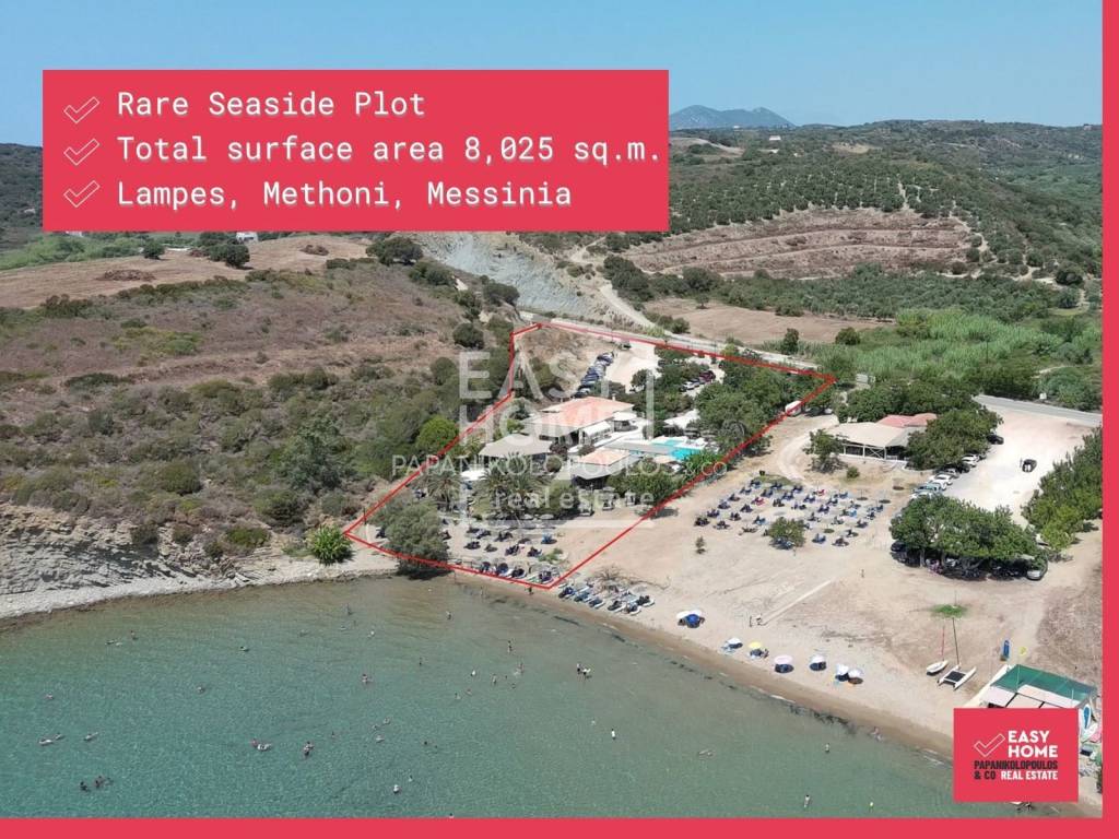 Rare Seaside Plot of 8,025 sq.m. This unique property is ideal for the creation of high-standard residences or for the construction of a tourist complex. It is located on the magical Lamps Beach, between Methoni and Finikounda, with frontage on the main road. On the property, there are buildings with a surface area of approximately 270 sq.m. that host a dining business, as well as a 130 sq.m. swimming pool. The building potential of the plot is 270 sq.m. for residences and can reach up to 1,600 sq.m. for a hotel unit for tourist facilities is used ( coefficient of 0.20 ). AREA Lampes is a small settlement with a beautiful coast of golden sand and crystal-clear waters, situated between Methoni and Finikounda. Methoni is a historic town with a rich tradition and distinctive architectural elements of Ionian style, officially designated as a traditional settlement. It is a highly touristic destination in the region of Messinia, offering all amenities and many activities for tourists who can visit the 93-acre Venetian Castle, featuring the iconic Bourtzi tower. Another attraction is the sunset, which locals and tourists visit to enjoy the most unobstructed view of the sun sinking into the blue waters of the bay. One of the area's highlights includes the stunning beaches and sea activities, such as a boat ride to the magical island of Sapientza. Here, you can discover the most breathtaking turquoise waters in the region, with postcard-like sandy beaches, the rare strawberry tree forest, and hiking trails—all with a view of the Bourtzi tower. DISTANCES Kalamata: 65 km Airport: 57 km Athens: 287 km Pylos: 15 km For more information, please contact us. EASYHOME - Papanikolopoulos & Co Real estate agency Tel. +30 27210 22122 / +30 210 220 2962 E-mail: hello@easyhome.com.gr In order to find more properties, visit our website www.easyhome.com.gr At EASYHOME Real Estate, we are a real estate agency that provides comprehensive property management services. With a strong team of real estate consultants, engineers, architects, lawyers, and notaries, we inform, advise, and handle every matter concerning your unique property or help you acquire your own. We operate in Messinia, Attica, and selected locations across Greece. - The information of the listed properties has been taken from documents given to us or by declaration of the owners and our company bears no responsibility for any wrong information. - In order to indicate the property, documents and certificates, it is necessary to indicate the police ID and the A.F.M. according to Law 4072/11-4-2012 Official Gazette 86 A. - The location of the property shown on the map is for reference only. - Republishing, copying, reproducing, or sharing the advertisements and photos is strictly prohibited without the written consent of EASYHOME Real Estate.