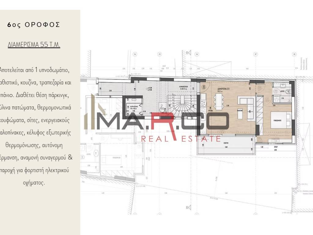 Apartment For sale, floor: 5th, in Pagkrati - Profitis Ilias. The Apartment is 55 sq.m.. It consists of: 1 bedrooms, 1 bathrooms and it also has 1 parkings (1 Underground). The property was built in 2025. Its heating is Personal with Fan coil, Air conditioning, Solar water system are also available, it has Alluminum, Thermal brake frames with Double glazed - Energy Efficient windows, the energy certificate is: A+ and its floors are Wooden. The property's status is: Under construction, it is close to Transportation, School, Square, Church, Super Market, City Center, it has Park, Openness, Unobstructed view and it has Southeast orientation. The Apartment is Bright, Airy, Ramp / Wheelchair access and it also has the following unique features and advantages: Window Screens, Elevator, Security door, CCTV, Security alarm, Three phase current, Electric shutters. Price: €210.000. MA.R.CO REALESTATE & CONSTRUCTION, contact phone: 6944855335, 2109650870, email: info@marco-realestate.gr, website: