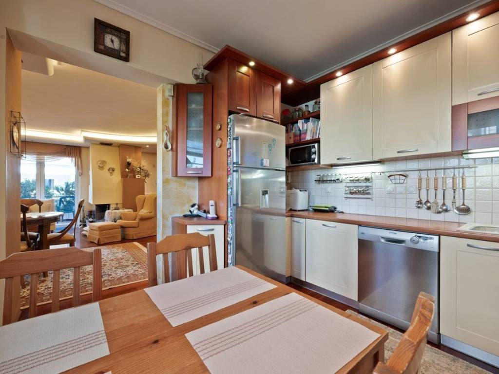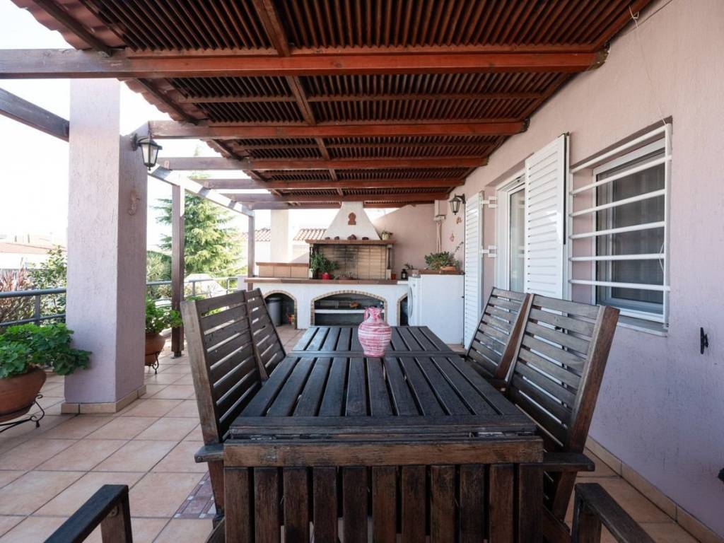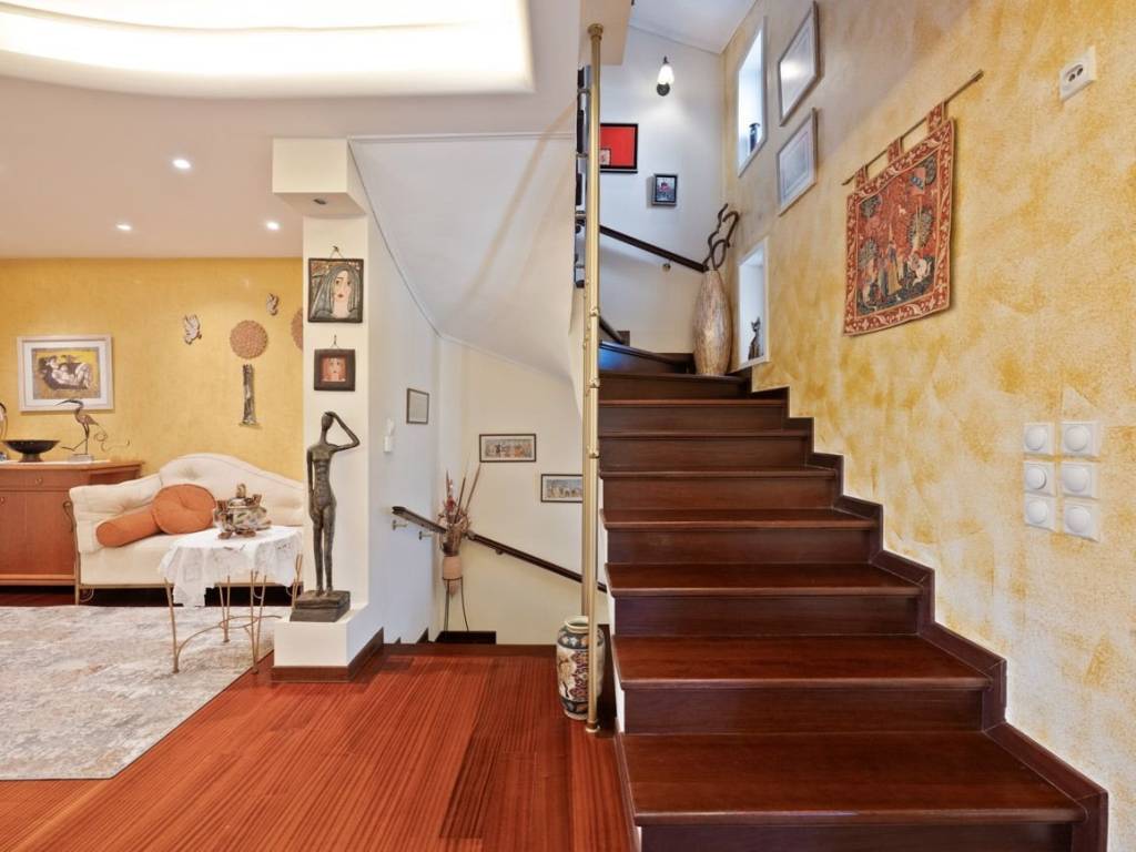 This exceptionally constructed maisonette of 241 sq.m. total area is located in the desirable area of Patima Chalandriou. Completed in late 2003 using premium materials, the residence provides all the modern comforts required for high-end family living. The ground floor features an expansive living and dining area finished with mahogany parquet flooring, a fireplace, recessed ceiling lighting, and an integrated Dolby Surround sound system. This level also includes a fully equipped kitchen with name-brand appliances and direct access to balconies. A wide iroko wood staircase connects the levels, leading to the first floor which hosts three bedrooms with decorative wall finishes and an elegant bathroom. The attic serves as a dedicated master suite, complete with an anteroom, a loft-style library, a private bathroom, and a spacious terrace featuring a built-in BBQ and unobstructed views of Mount Penteli. Functional utility is found in the semi-basement, which offers a playroom or office space, a bathroom, a secondary large kitchen, and ample storage, with the added benefit of a potential independent entrance. The home is technically complete with autonomous natural gas heating per floor, air conditioning, a CCTV security system, and integrated internet networking throughout the main areas. The property is finalized with two outdoor parking spaces, representing a high-standard residence that seamlessly blends quality construction with scenic views. Patima Chalandriou is a model residential zone in the northeastern suburbs, combining residential tranquility with direct access to major road networks such as Attiki Odos and the Doukissis Plakentias Metro station. The area is characterized by modern urban planning, low-density housing with newly built residences, and an abundance of new squares and green spaces that enhance the quality of life.