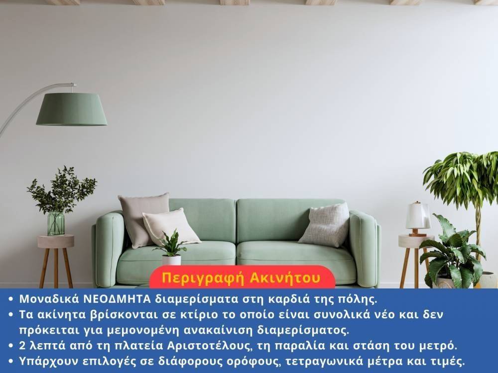 Modern, newly built apartments for sale in a brand-new building in the heart of the city, just 2 minutes from Aristotelous Square, the seafront, and a metro station. These are not individual apartment renovations, but an entirely new building with all installations (electrical, plumbing, elevator, etc.) completely new, ideal for owner-occupation or high-value investment.