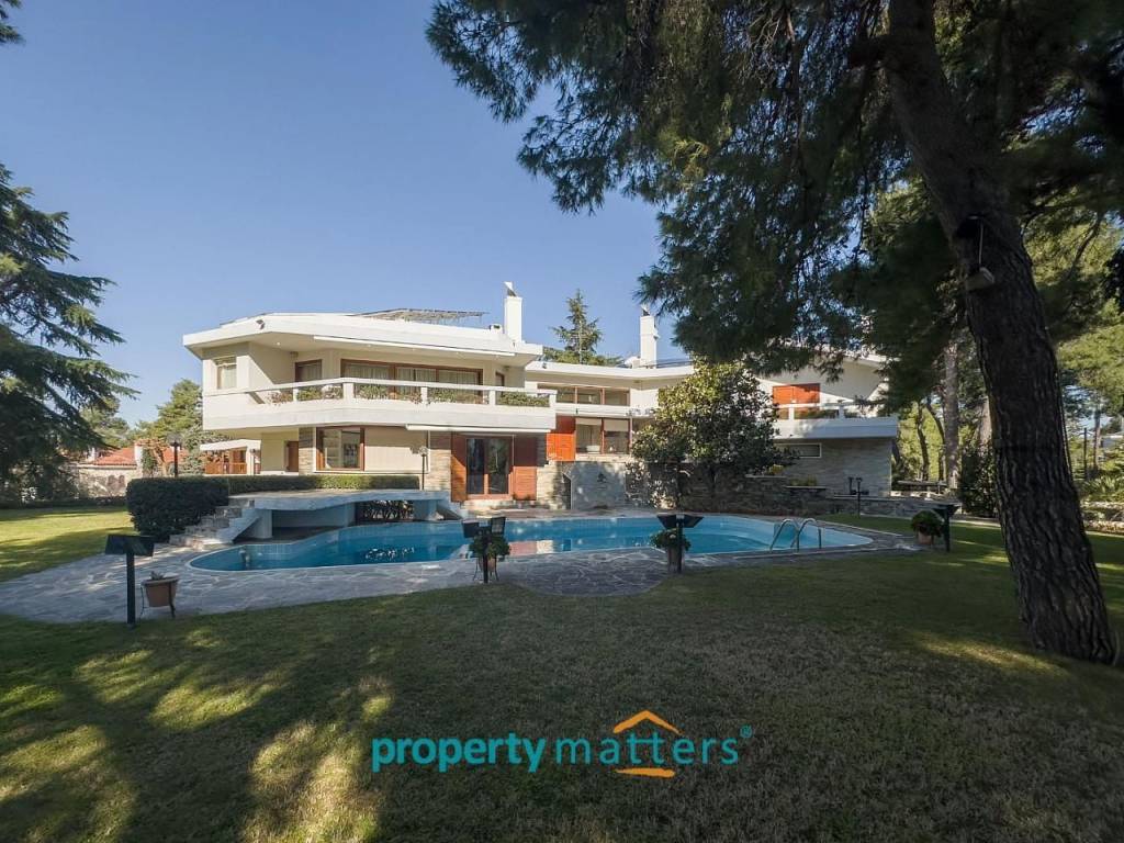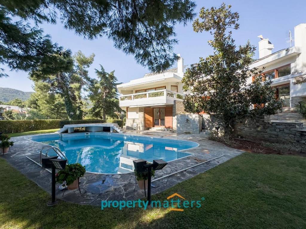 Located in the heart of lush-green Dionysos, in one of the most privileged areas, this exceptional 800 sq.m. villa is available for sale, offering a unique combination of comfort, luxury, and absolute privacy. Built in 1987 with high-quality materials and exquisite aesthetics, the property sits on a corner plot of 1,750 sq.m., surrounded by a beautifully landscaped garden with dense greenery, a basketball court, and a large swimming pool. Architecture and Layout: The villa spans three main levels with a total living area of 500 sq.m., in addition to 120 sq.m. of auxiliary spaces. Furthermore, within the same plot, there is an independent apartment of 155 sq.m. Elevated Ground Floor (Main Entrance): The main entrance leads to a spacious double-height reception area, featuring an imposing fireplace that dominates the space, creating a grand atmosphere. From here, an elegant staircase provides access to the primary living area, which boasts oak flooring and accommodates two sitting areas, a stylish bar, and a large dining area. Adjacent to this space, there is a cozy family living room with a second fireplace, a casual dining area, and a functional open-plan kitchen, equipped with high-end appliances. A guest WC completes this level. Ground Floor (Sleeping Quarters & Direct Garden Access): The ground floor, with direct access to the garden and pool, houses the sleeping quarters. This level includes five bedrooms, among which the master suite stands out with its en-suite bathroom, spacious walk-in closet, and private garden access. Additionally, there are four well-sized and bright children's bedrooms. This floor also features two more bathrooms—one of which is a family bathroom with three separate showers—as well as an extra WC. Semi-Basement (Playroom & Auxiliary Spaces): The lower level of the villa, which benefits from natural light and has an independent entrance, includes a large playroom with a fireplace—ideal for relaxation and entertainment. This level also features a fully equipped ergonomic kitchen, a dining area, a bathroom, a staff bedroom, and various auxiliary spaces, such as three large storage rooms, a laundry room, a sauna, and the property's mechanical room. Additional Features and Amenities: This high-end property is equipped with premium construction features and luxury amenities, ensuring maximum comfort and functionality: Independent oil heating system Solid wood frames with double security glazing Security alarm system Secondary service staircase Covered parking space for 4+ vehicles Basketball court Complete fencing for absolute privacy This villa is an ideal choice for families seeking a combination of luxury, comfort, and a connection with nature in one of the most sought-after areas of northern Athens.