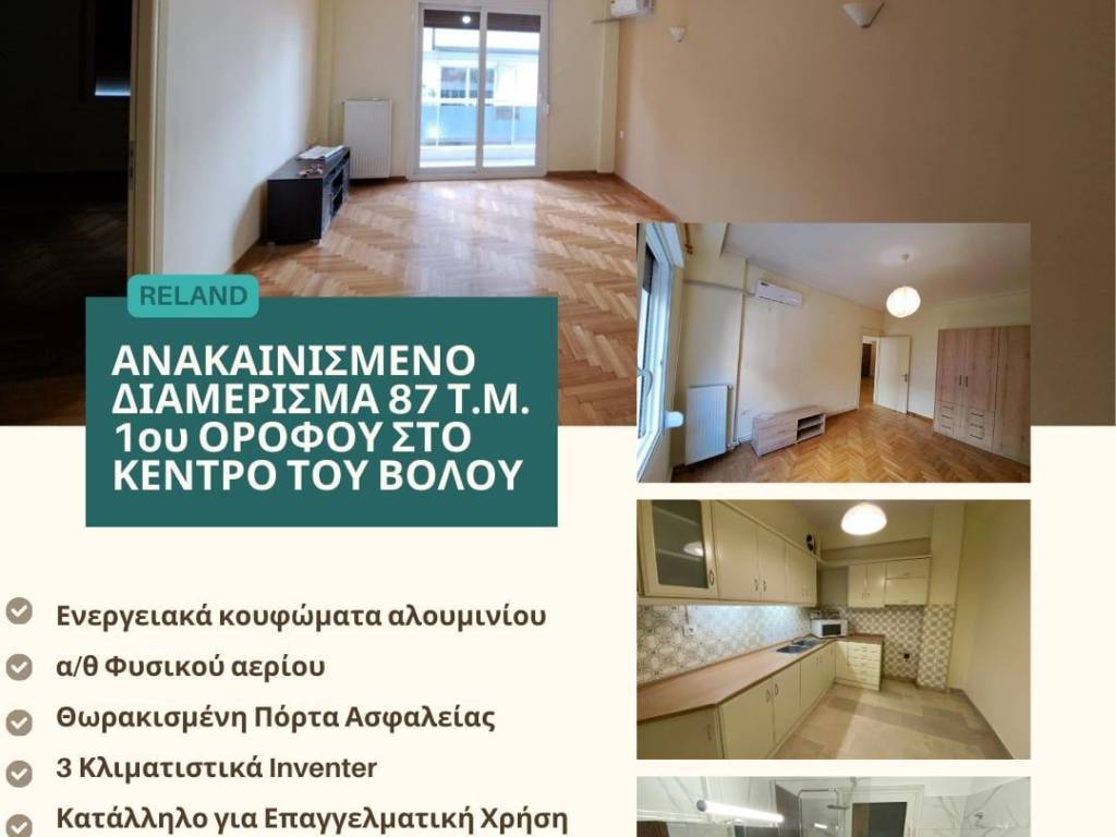 Renovated Apartment 87 sq.m. for Rent | Volos City Center ✨ Renovated 87 sq.m. apartment, on the 1st floor, in a prime location in the center of Volos. Ideal both for residential and professional/office use. Layout: ️ Spacious living room Kitchen ️ Bedrooms Bathroom Balcony Features: Energy-efficient aluminum frames Individual natural gas heating ❄️ 3 inverter air conditioning units Armored security door Bright & front-facing 1st floor Suitable for professional use Located in the heart of Volos, close to shops, services and public transport. Price: 680€ / month Available immediately Contact: RELAND Real Estate inforelandvolos@gmail.com 697 008 0280