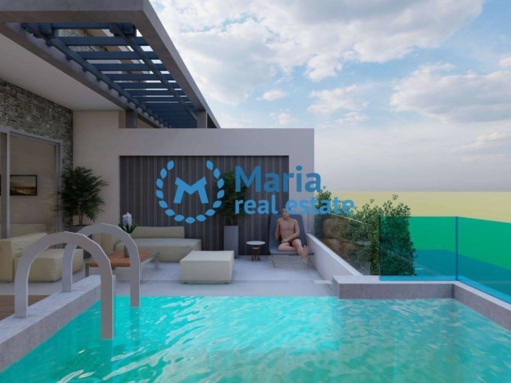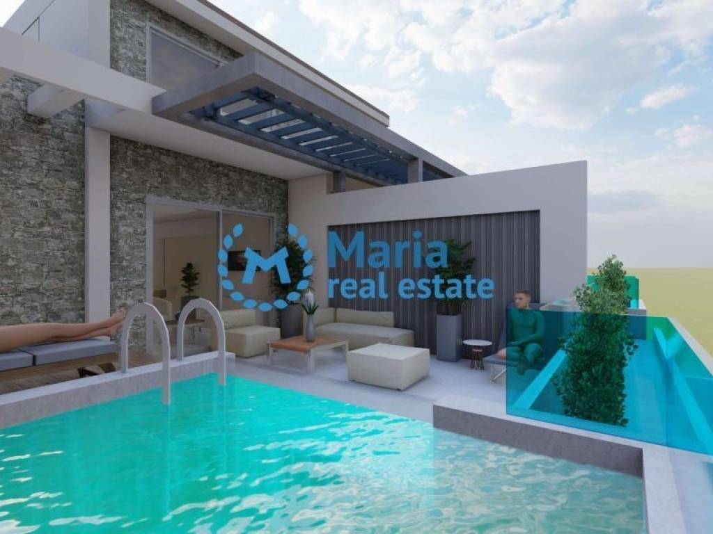 Property code 18142 Seven first floor maisonettes under construction for sale with an area of 65 sq.m. in Asprovalta, Thessaloniki. Each apartment consists of a living room with a kitchen, two bedrooms, a bathroom and a balcony with a private pool. They feature synthetic window frames with nets, a solar water heater, installation for air conditioning, external thermal insulation, a private parking space. They are located 180 meters from the sea. Prices from 265.000 euros