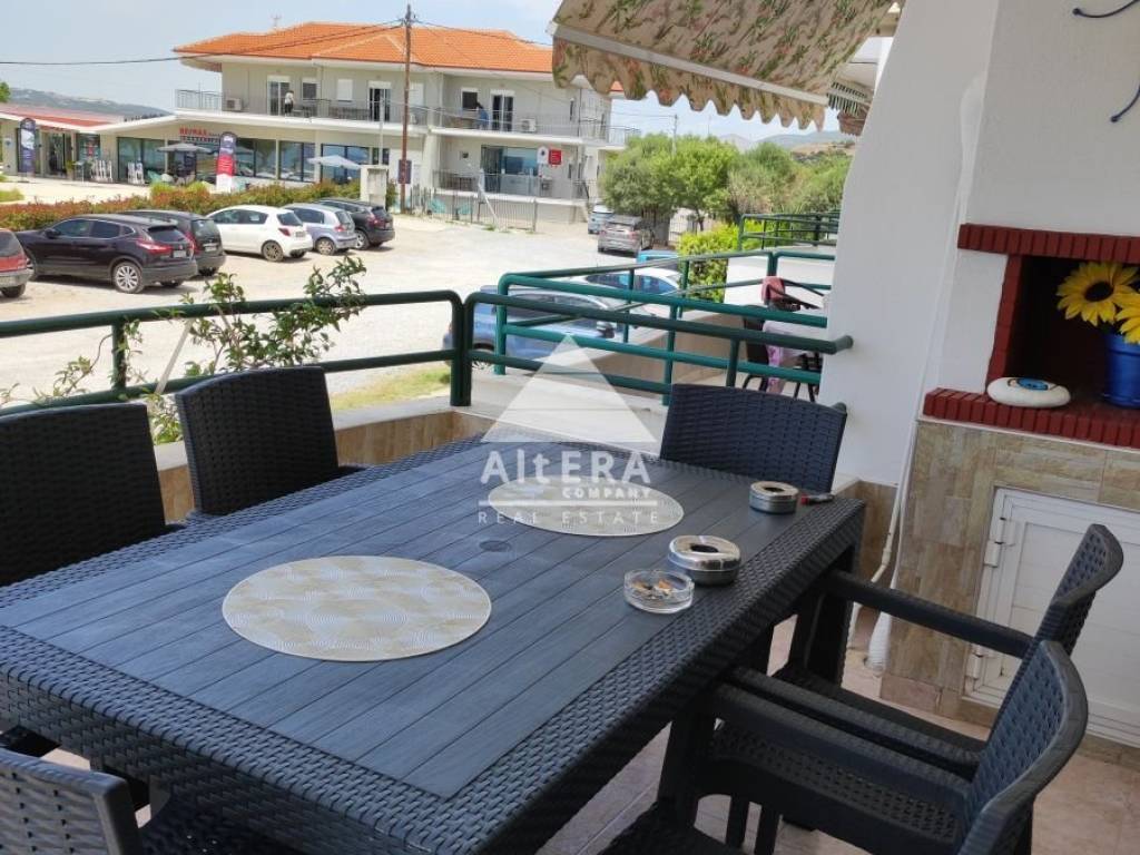 Ofrinio Beach, Kavala: Maisonette for sale with sea view 70m from the beach. The main entrance is on the raised ground floor of 43.98 sq.m. with a spacious living room, kitchen, bathroom and large balcony with sea view. An internal staircase leads us to the semi-basement, which consists of a hall, three rooms, a storage room and a WC. The maisonette has oil heating, fireplace, solar water heater, aluminum frames, BBQ and awning.