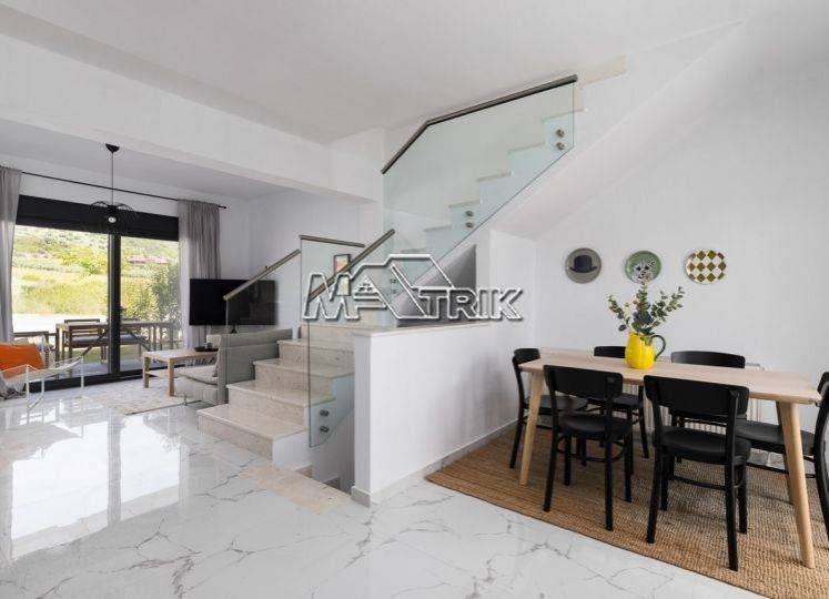 Chalkidiki, Nea Skioni, 132 sqm maisonette in a complex of two maisonettes. It consists of four bedrooms, a living room - kitchen and two bathrooms. It has aluminum sliding and recoil window frames, tiled floor, armorized door, four a/c, individual heating system with oil, solar water heater, external linding with thermal façade, storage, exclusive-use courtyard in front and back of 50 sqm, one exclusive-use parking space, as it is fully furnished and equipped with all electrical appliances. It is located very close to the local market and its distance from the sea is 400m. Along with it is also available a maisonette of the same characteristics without furnishing at a price of 259000 euros.