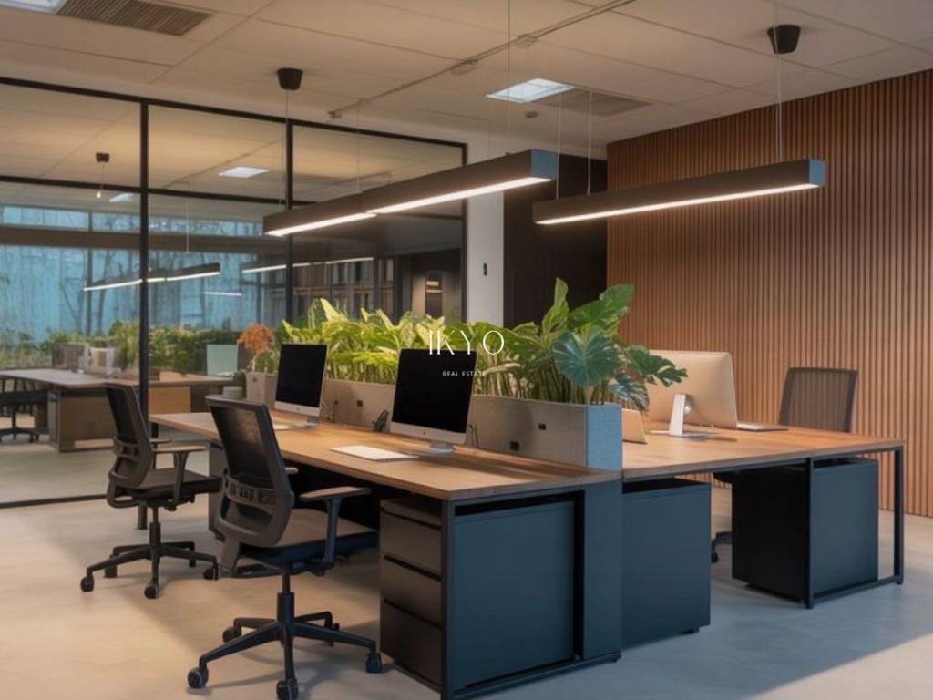 MAROUSI Modern Office for Rent, 555 sq.m. The office extends over two levels (290 sq.m. ground floor and 265 sq.m. mezzanine). In its current layout, it accommodates 29 workstations. The premises can be delivered in Warm Shell condition, including construction of WC facilities and a kitchen, installation of new flooring, air conditioning and ventilation system, central electrical panel, and central water supply and drainage points.