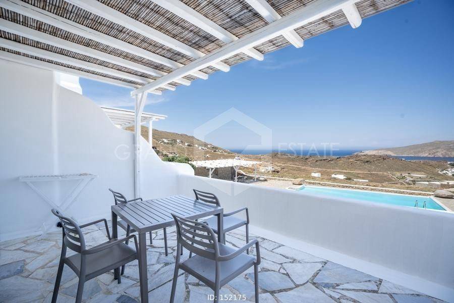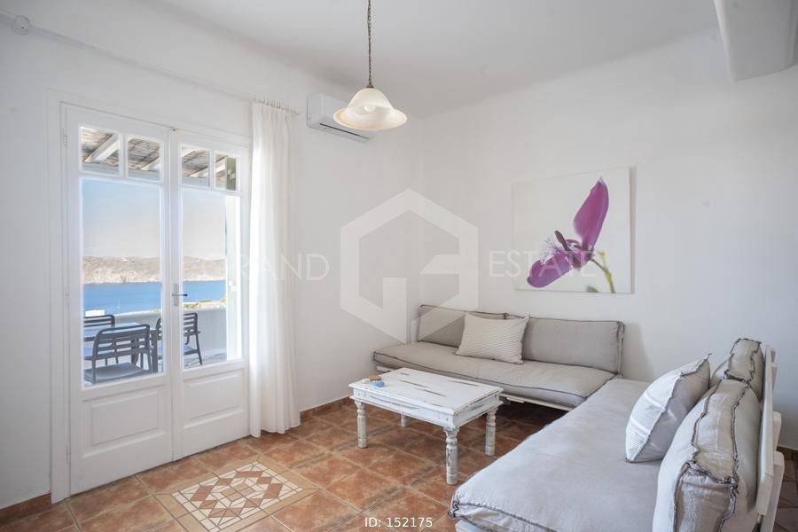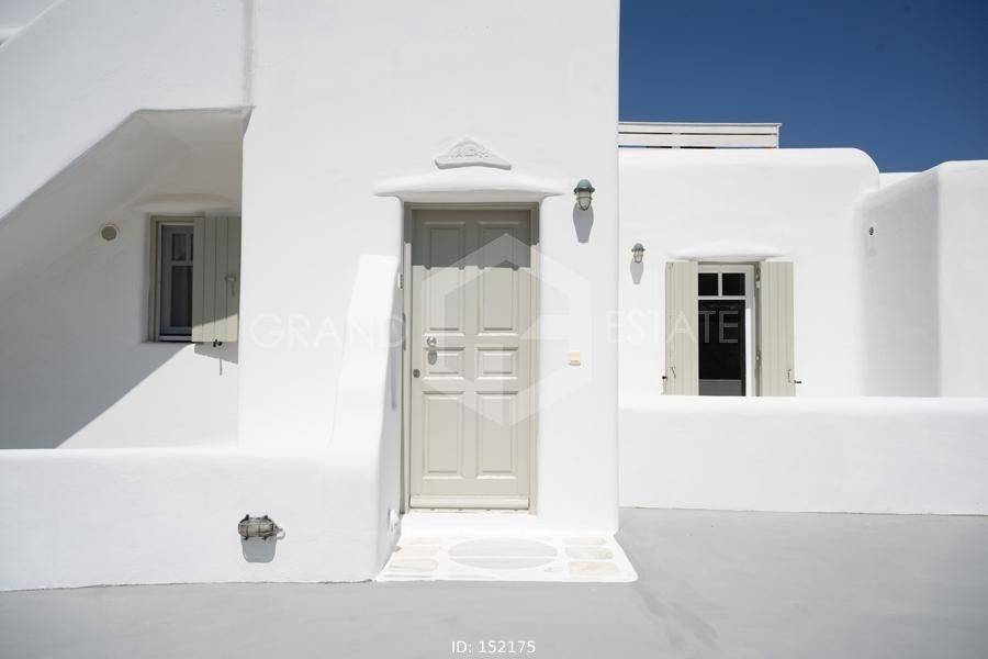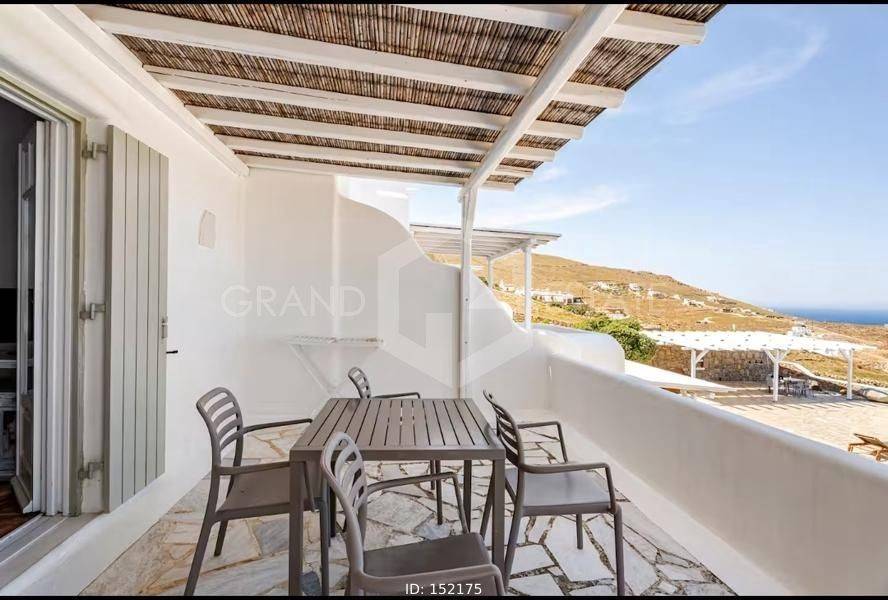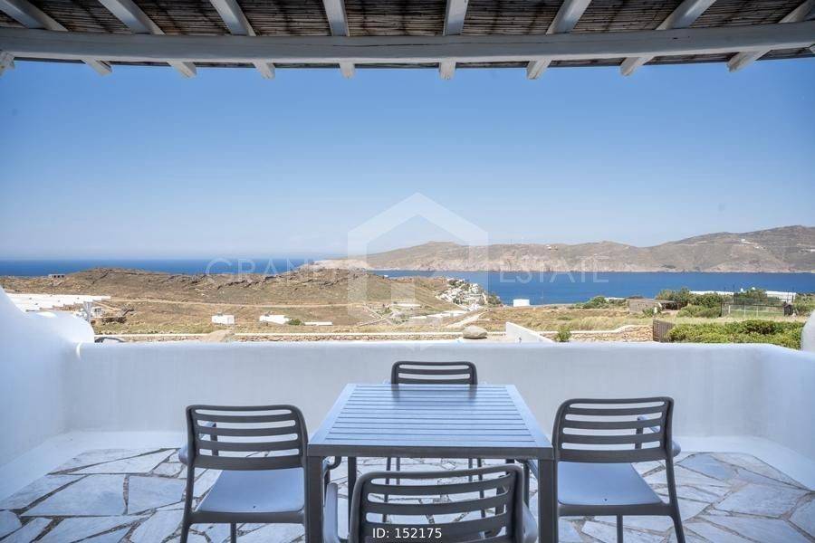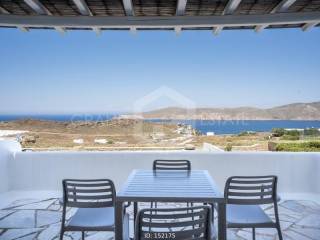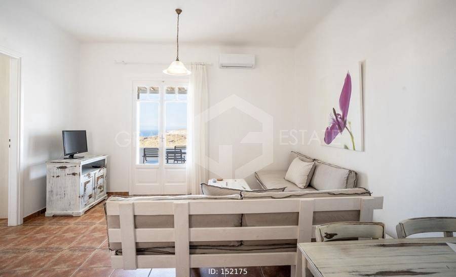Mykonos, Panormos - Apartment 54sqm plot 4050sqm, fully furnished, bedroom, 1st floor, excellent condition, year built 2006, energy class D, living room, kitchen, bathroom, heating type: autonomous (electricity), air condition, a/c type vrv, quiet, luminous, sea view, frontage, painted, boiler, balconies, large balconies, tents, garden, built in appliances, wooden frames, double glazed windows, door screen, ceramic tiles floors, surveillance cameras, luxurious, swimming pool, barbeque, satellite, internet, residential zone, access from asphalt, investment property. Wonderful apartment 54m2 in a complex of 12 residences, with a large mature shared garden including a small chapel, a large comon use swimming pool, shared bbq, outdoor bathrooms & showers. The apartment has a large terrace with a view to the sea, an open-plan living room, dining area and kitchen, a bedroom and a bathroom with bath tab. It has air conditioning, a boiler for hot water, is fully furnished and equipped with electrical appliances (flat screen TV, iron, kitchenette, small fridge, hairdryer, coffee maker. It is located in the beautiful bay of Panormos, in the northeastern part of the island, just 10 minutes by car (or motorbike) from Mykonos town or the airport and 15 minutes from the famous beaches of Elia and Super Paradise. Panormos beach, just a 10 minute walk away, named after the bay, is one of the few beaches on the island that remains truly unspoilt. It has a nice long strip of white sand with crystal blue waters and enjoys a little more protection from the winds. The property's clear and ready for its new owner. Ideal for a holiday home and high yield investment. Viewings will be realised after the 20th of March.