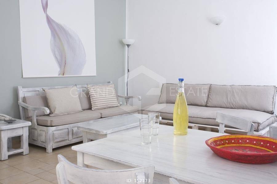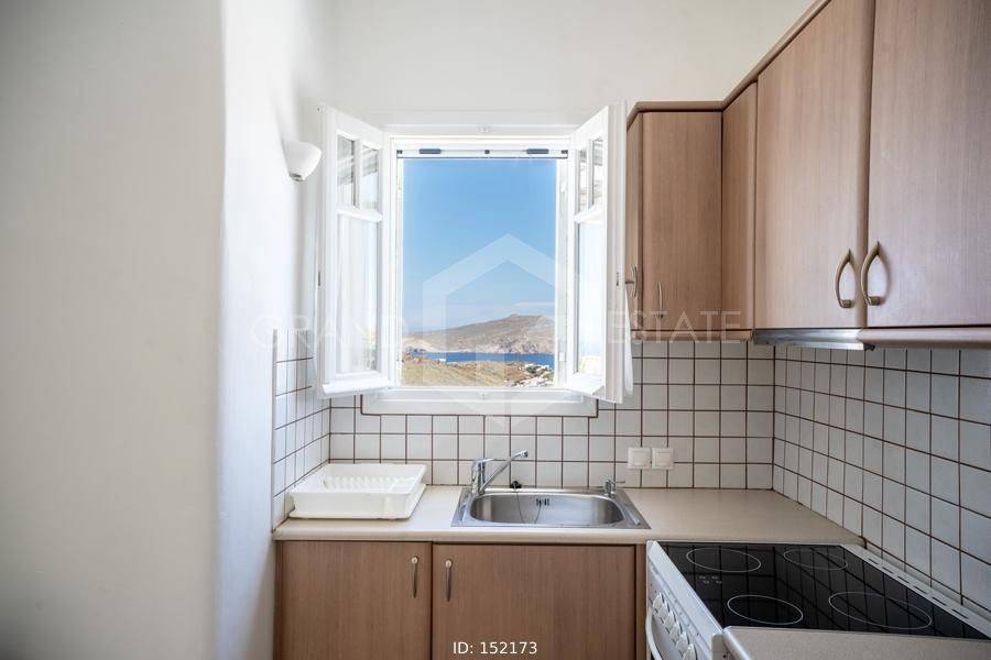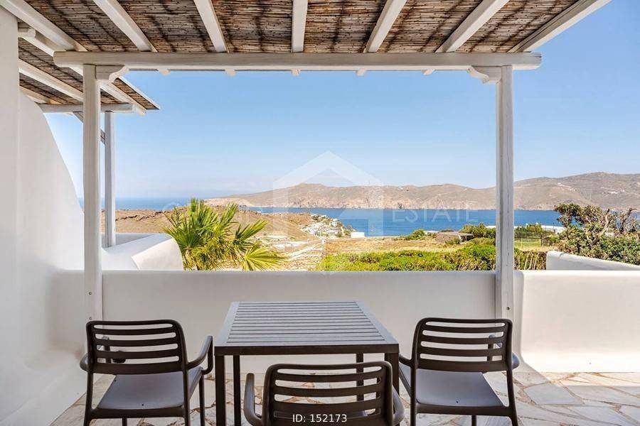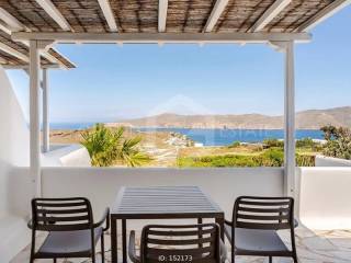 Mykonos, Panormos - Apartment 54sqm plot 4050sqm, fully furnished, bedroom, 1st floor, excellent condition, year built 2006, energy class D, living room, kitchen, bathroom, heating type: autonomous (electricity), air condition, a/c type vrv, quiet, luminous, sea view, frontage, painted, boiler, balconies, large balconies, tents, garden, built in appliances, wooden frames, double glazed windows, door screen, ceramic tiles floors, surveillance cameras, luxurious, swimming pool, barbeque, satellite, internet, residential zone, access from asphalt, investment property. Wonderful Apartment 54m2 in a complex of 12 residences, with a large mature shared garden including a small chapel, a large comon use swimming pool, shared bbq, outdoor bathrooms & showers. The apartment has a large terrace with a view to the sea, an open-plan living room, dining area and kitchen, a bedroom and a bathroom with bath tab. It has air conditioning, a boiler for hot water, is fully furnished and equipped with electrical appliances (flat screen TV, iron, kitchenette, small fridge, hairdryer, coffee maker. It is located in the beautiful bay of Panormos, in the northeastern part of the island, just 10 minutes by car (or motorbike) from Mykonos town or the airport and 15 minutes from the famous beaches of Elia and Super Paradise. Panormos beach, just a 10 minute walk away, named after the bay, is one of the few beaches on the island that remains truly unspoilt. It has a nice long strip of white sand with crystal blue waters and enjoys a little more protection from the winds. The property's clear and ready for its new owner. Ideal for a holiday home and high yield investment. Viewings will be realised after the 20th of March.
