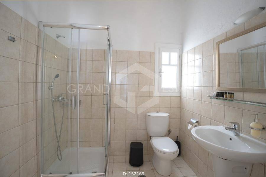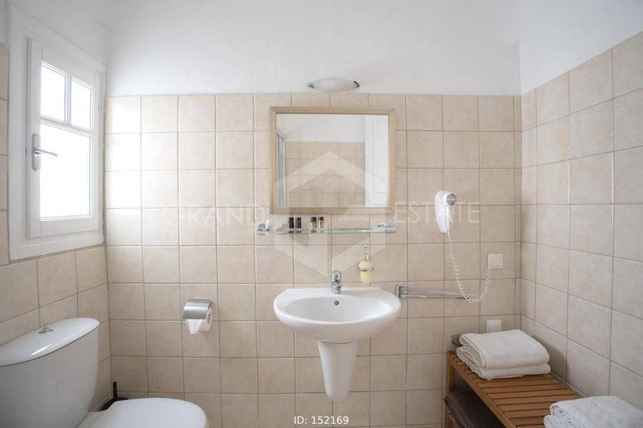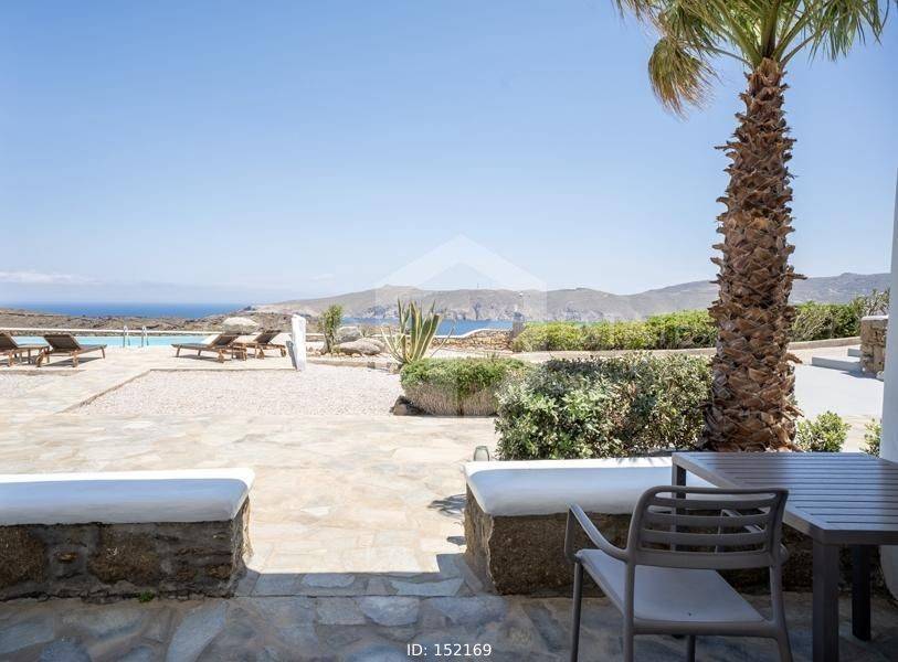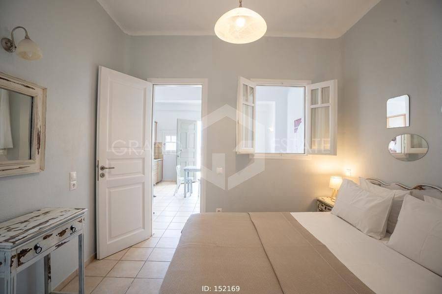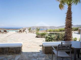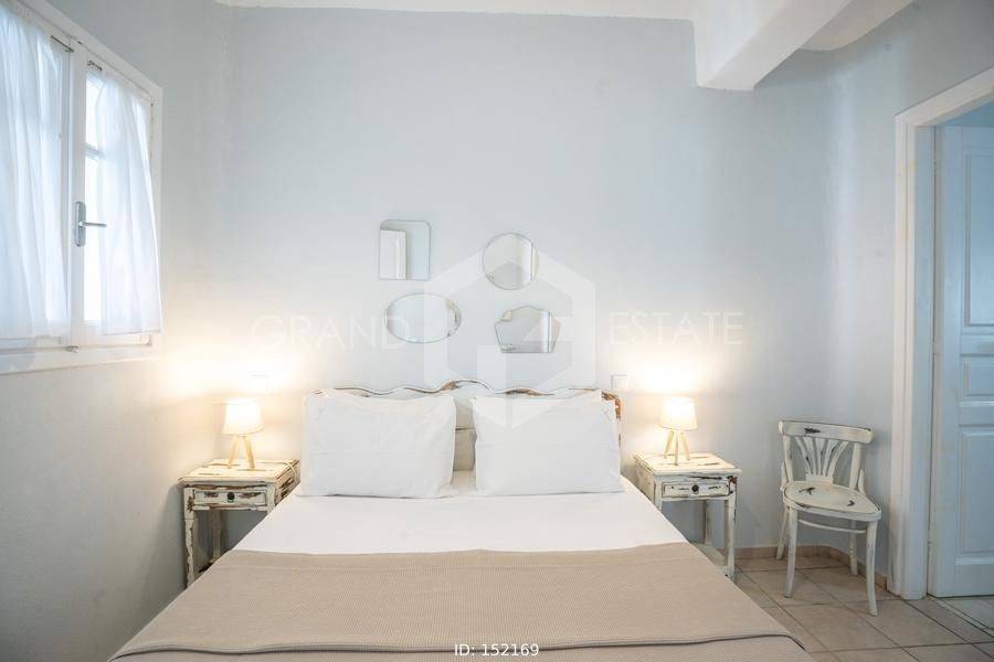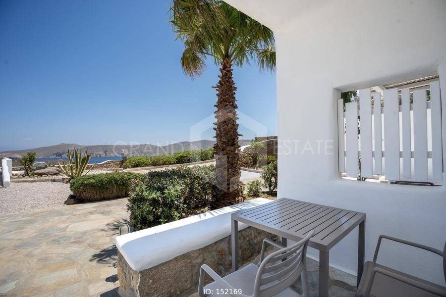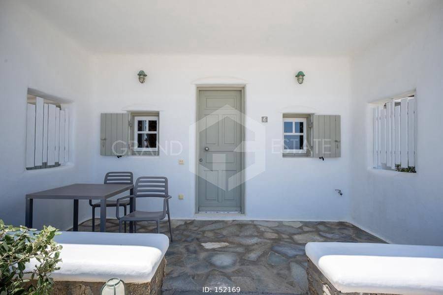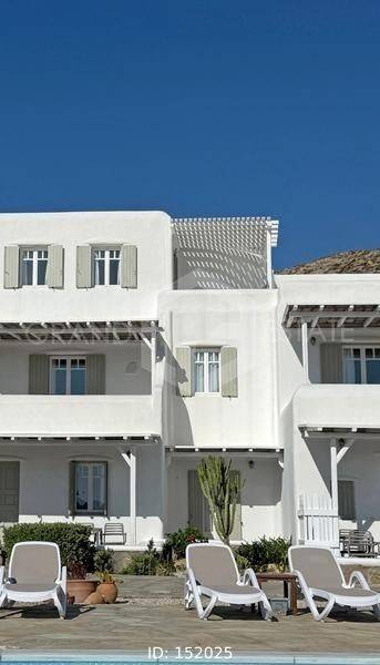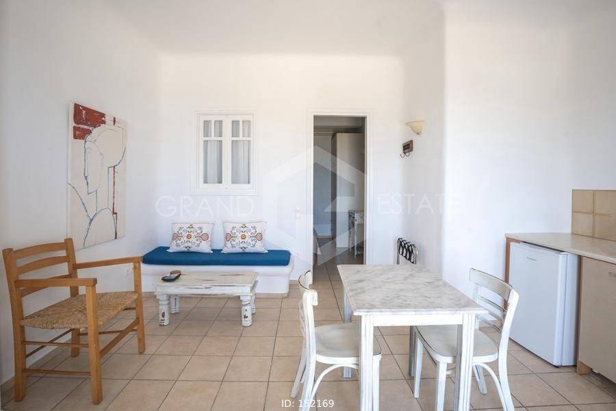 Mykonos, Panormos - Apartment 44sqm plot 4050sqm, fully furnished, bedroom, ground floor, excellent condition, year built 2006, energy class D, living room, kitchen, bathroom, heating type: autonomous (electricity), air condition, a/c type vrv, quiet, luminous, sea view, frontage, painted, boiler, balconies, large balconies, tents, garden, built in appliances, wooden frames, double glazed windows, door screen, ceramic tiles floors, surveillance cameras, luxurious, swimming pool, barbeque, satellite, internet, residential zone, access from asphalt, investment property. Wonderful two space apartment of 44m2 in a complex of 12 residences, with a large mature shared garden including a small chapel, a large comon use swimming pool, shared bbq, outdoor bathrooms & showers. The apartment has a large terrace with a view of the pool and the sea, an open-plan living room, dining area and kitchen, a bedroom and a bathroom with shower. It has air conditioning, a boiler for hot water, is fully furnished and equipped with electrical appliances (flat screen TV, iron, kitchenette, small fridge, hairdryer, coffee maker. It is located in the beautiful bay of Panormos, in the northeastern part of the island, just 10 minutes by car (or motorbike) from Mykonos town or the airport and 15 minutes from the famous beaches of Elia and Super Paradise. Panormos beach, just a 10 minute walk away, named after the bay, is one of the few beaches on the island that remains truly unspoilt. It has a nice long strip of white sand with crystal blue waters and enjoys a little more protection from the winds. The property's clear and ready for its new owner. Ideal for a holiday home and high yield investment. Viewings will be realised after the 20th of March.