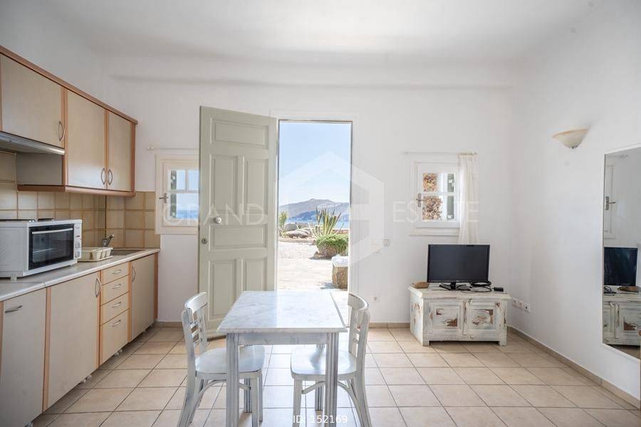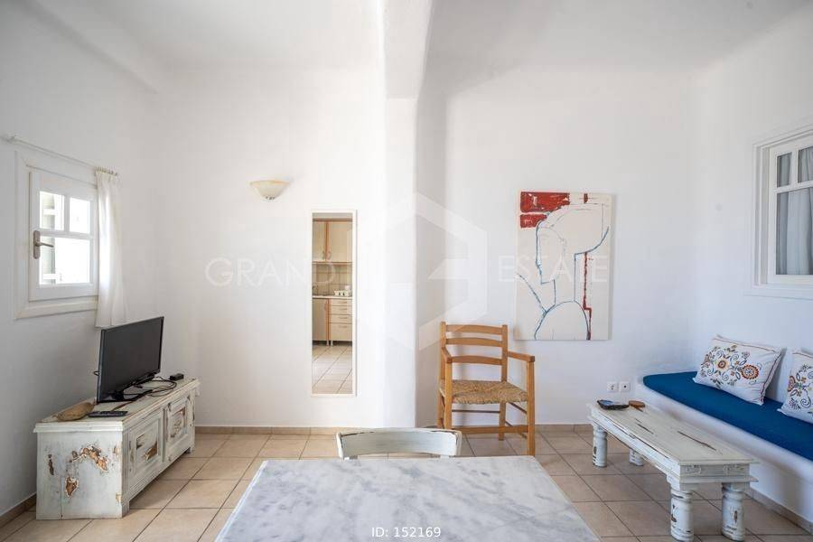 Mykonos, Panormos - Apartment 40sqm plot 4050sqm, fully furnished, bedroom, ground floor, excellent condition, year built 2006, energy class D, living room, kitchen, bathroom, heating type: autonomous (electricity), air condition, a/c type vrv, quiet, luminous, sea view, frontage, painted, boiler, balconies, large balconies, tents, garden, built in appliances, wooden frames, double glazed windows, door screen, ceramic tiles floors, surveillance cameras, luxurious, swimming pool, barbeque, satellite, internet, residential zone, access from asphalt, investment property. Wonderful two space apartment 40m2 in a complex of 12 residences, with a large mature shared garden including a small chapel, a large comon use swimming pool, shared bbq, outdoor bathrooms & showers. The apartment has a large terrace with a view of the pool and the sea, an open-plan living room, dining area and kitchen, a bedroom and a bathroom with shower. It has air conditioning, a boiler for hot water, is fully furnished and equipped with electrical appliances (flat screen TV, iron, kitchenette, small fridge, hairdryer, coffee maker. It is located in the beautiful bay of Panormos, in the northeastern part of the island, just 10 minutes by car (or motorbike) from Mykonos town or the airport and 15 minutes from the famous beaches of Elia and Super Paradise. Panormos beach, just a 10 minute walk away, named after the bay, is one of the few beaches on the island that remains truly unspoilt. It has a nice long strip of white sand with crystal blue waters and enjoys a little more protection from the winds. The property's clear and ready for its new owner. Ideal for a holiday home and high yield investment. Viewings will be realised after the 20th of March.