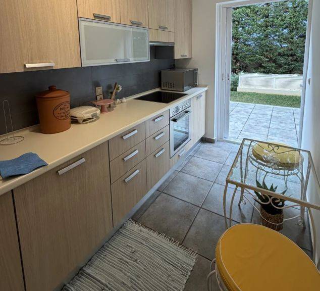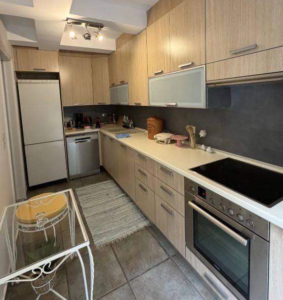 Available for rent, renovated and fully furnished apartment 75 sq.m., ground floor, in the area Voula – Center. The property consists of two bedrooms (1 master), one bathroom, one kitchen, and a spacious living room, offering a functional and comfortable layout for daily living. It also includes one parking space in the pilotis, access to a garden with lawn, and a spacious yard. It features autonomous heating with oil, air conditioning, aluminum frames with double energy glass, tiled floors, and is painted and in very good condition. The apartment is front-facing, bright, with a south-facing orientation and views of greenery and open space. It is located close to transportation, park, sea, square, supermarkets, market, and dining areas. The indicated location is approximate. For more information or to schedule a visit: KOSMOS REAL ESTATE Property Manager: Kosmopoulos Alexis – 6986109593 info@kosmosrealestate.gr www.kosmosrealestate.gr