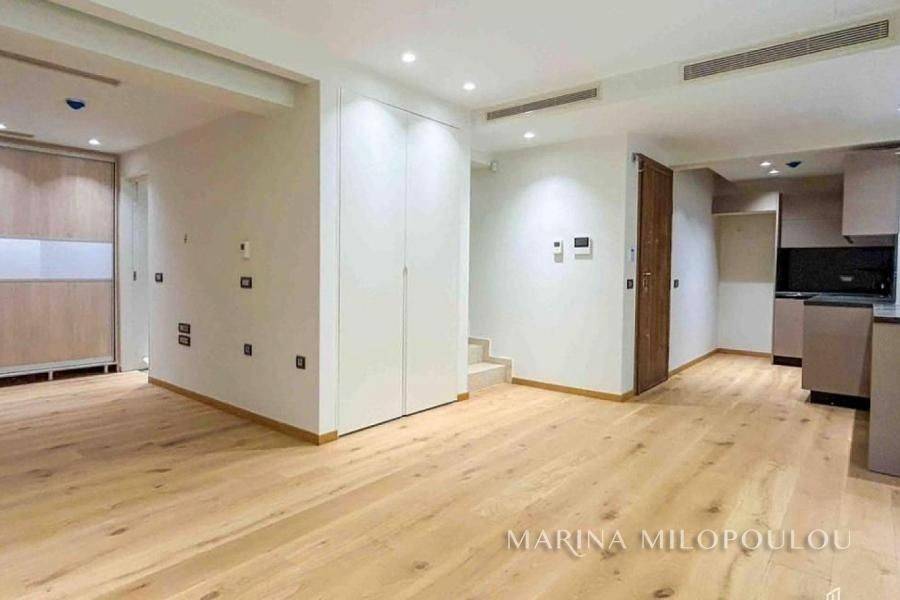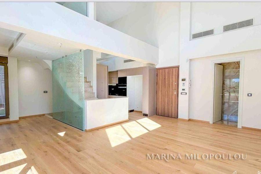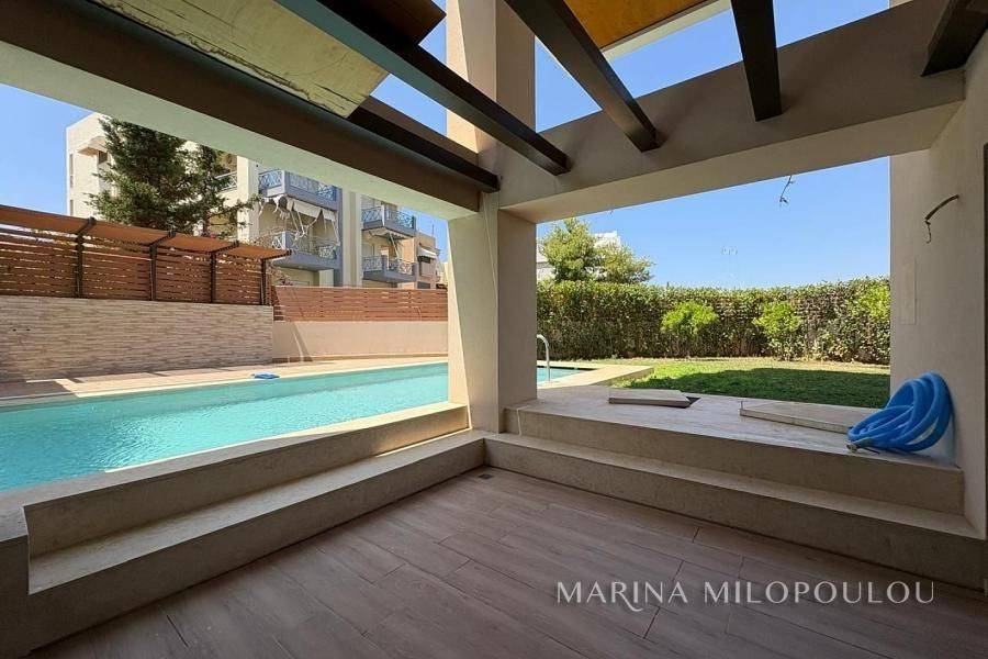 VOULA, in a newly built 4-storey building, maisonette on the ground floor - semi-basement and a loft-type balcony, total surface 172 sq.m., with an exclusive garden of and a swimming pool. Minimal aesthetic, excellent construction of high energy class (A) It is at the rear side of the building and has west orientation. - Ground floor, 77 sqm, an impressive reception area (double hight), open plan kitchen, 1 master bedroom and 1 wc. Exit to the garden (180 sqm) with the pool (32 sqm) and BBQ. - Loft, 43,5 sqm, 1 master bedroom and study space. - Semi-basement, 50 sqm, playroom/guest room with kitcenette, 1 bathroom and laundry. Large openings from cour-anglaise ensure abundant natural lighting. It features oak floors, double glazing, electrical shutters, nets, security door and alars, heat pump, natural gas underfloor heating, basement garage and storage. Only in 600 meters from the sea and the local shopping center, 1,3 km from Voula's organized beach and the Tram terminal, 1,8 km from Voula's center and 22 km from the intern. airport.