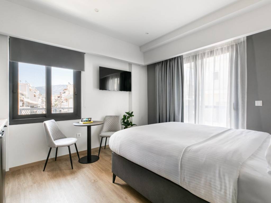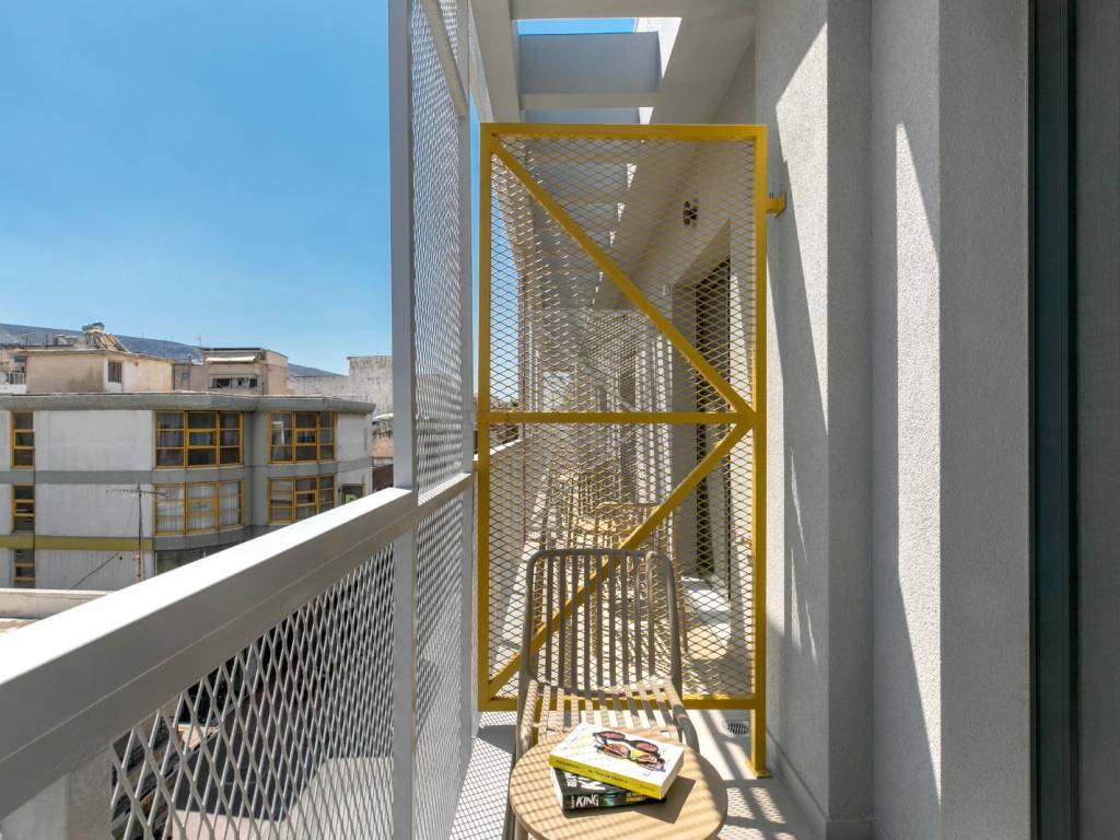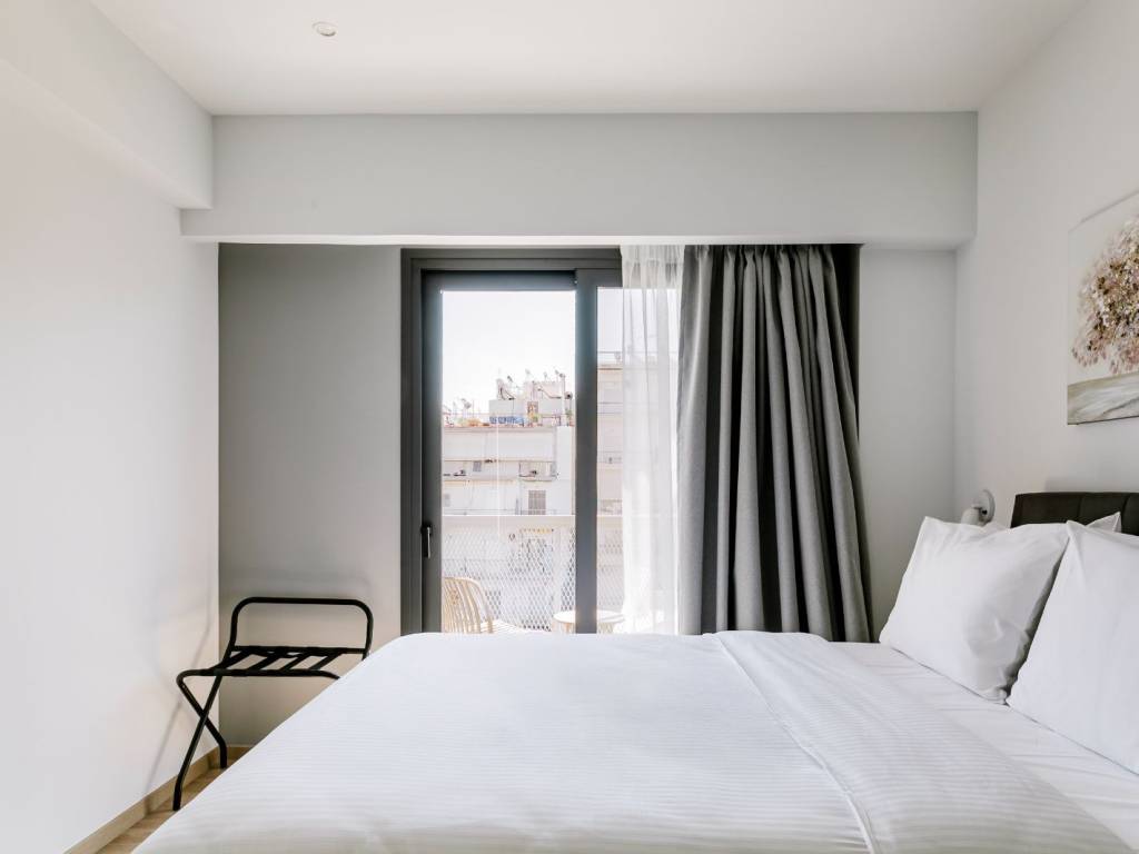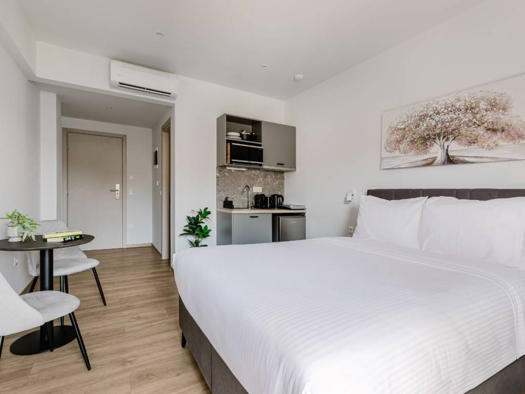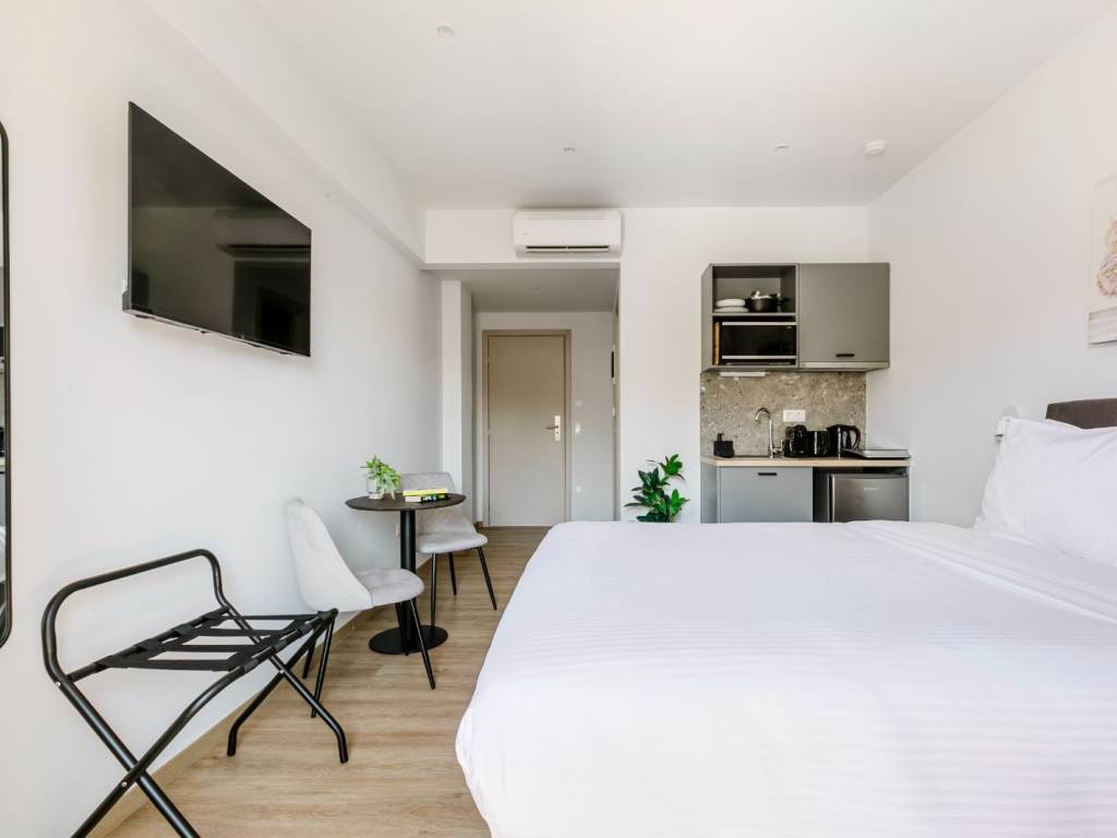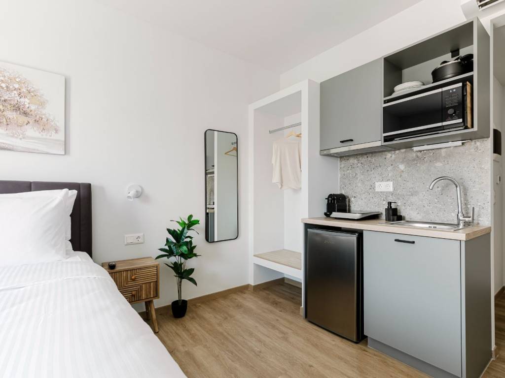 The studio is an open-plan space with a double bed and a small kitchen with a hob, fridge, sink, and cooking and dining utensils. There is also a dining area and access to an outdoor terrace. The bathroom has a shower and all necessary toiletries. The studio is air-conditioned and features the latest technology: online check-in and check-out, smart TV, and high-speed Wi-Fi.