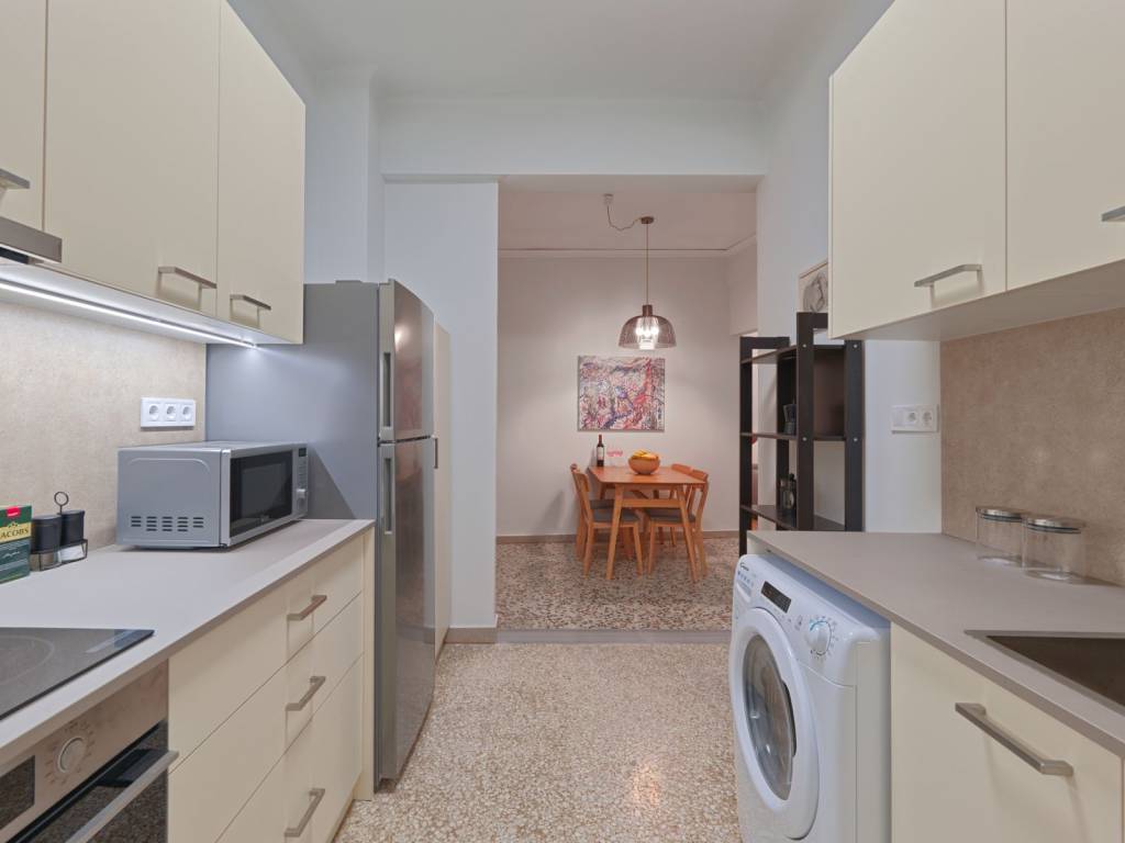 Recently renovated two-room apartment (51 m²) features two small balconies. Located on the second floor of a building with an elevator. Fully furnished and fully equipped, including two air-conditioning units, ceiling ventilation fans, and central heating. Price includes all bills: electricity, water, high-speed fiber internet (100 Mbps Wi-Fi), and building fees. 300 m from the Viktoria Metro station, with supermarkets, bakery, and all daily facilities within immediate walking distance. Ideal for a single tenant or a couple.