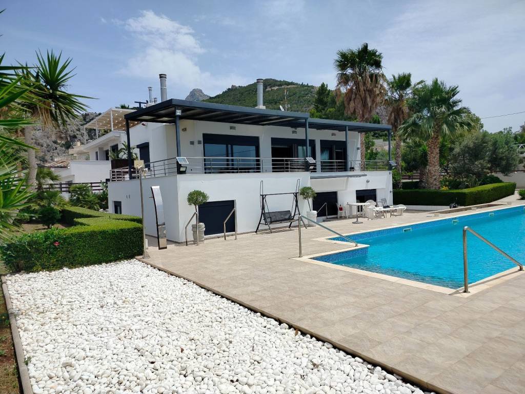 For sale seaside villa of 370 sqm in front of the sea, in Loutraki, Corinth This is a luxurious construction, with a swimming pool, on a plot of 1,800 sq m. with a panoramic view of the endless blue. More specifically, it is located in the Flambouro area of ​​Loutraki. It is a unique high-standard residence, with minimal architecture, built on two levels. Specifically - lower level with large living room, energy fireplace, open plan kitchen, fully equipped with electrical appliances, two en suite bedrooms with their own bathroom, office, guest wc, laundry room, bathroom with shower, internal elevator leading to the upper floor, independent entrance with the possibility of communication between the two floors, access to the garden and the swimming pool. -Upper level with an imposing living room, fireplace, bar, fully equipped with kitchenette and electrical appliances, large master bedroom with bathroom, dressing room, wc, access to a large terrace with a unique sea view and a terrace with a pergola. The house is sold fully furnished with tasteful designer furniture and electrical appliances, as well as its equipment. In addition, it has 47 sq.m. utility rooms, five-car parking, 107 sq.m. swimming pool, outdoor bar, heated jacuzzi,generator, dog cage, caravan, roof photovoltaics connected to the PPC, beautiful garden with trees and flowers and has direct access to a sandy beach. This is a VIP villa, ideal either for permanent residence or for tourist exploitation, due to its location, the quality of its construction and easy access to Loutraki, creating an excellent investment opportunity. "For any information or to make an appointment, do not hesitate to contact us.