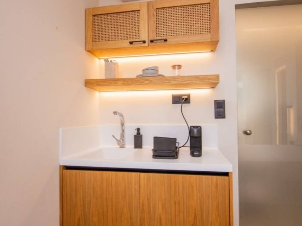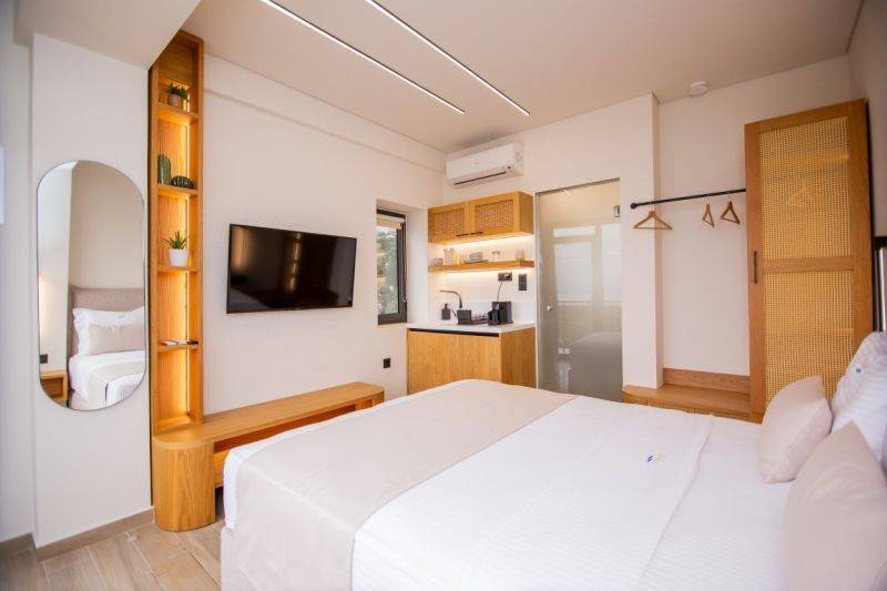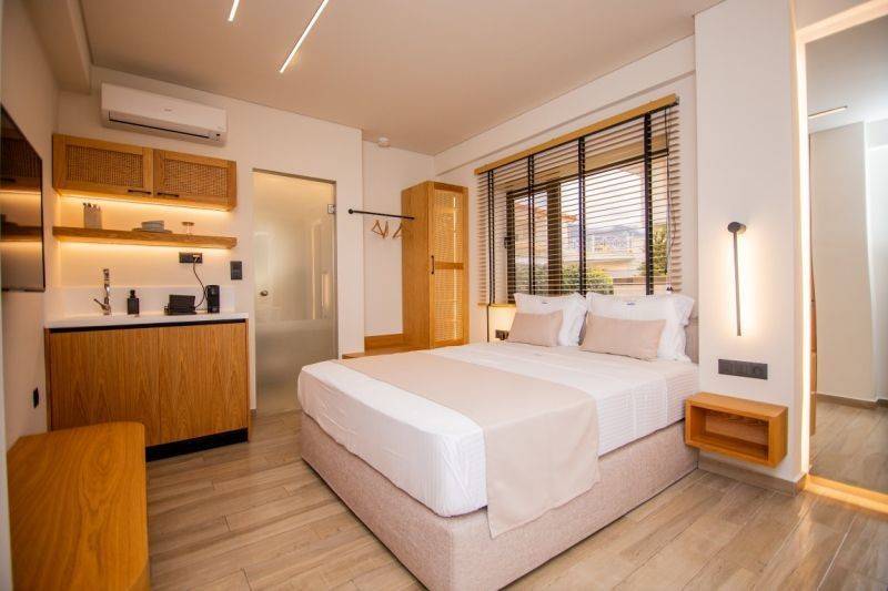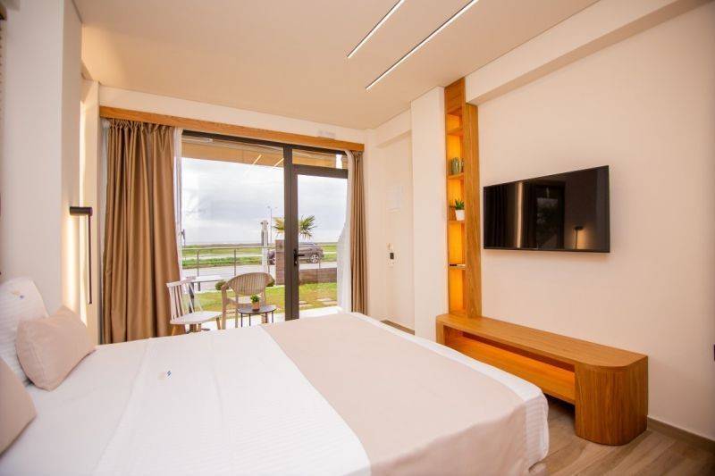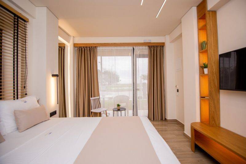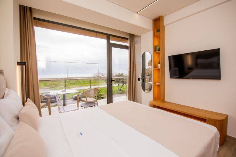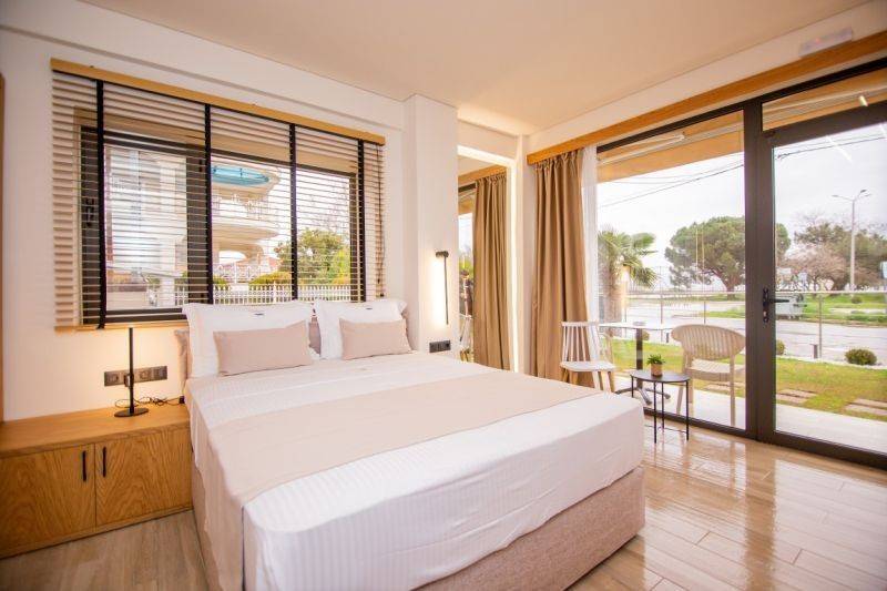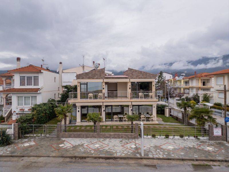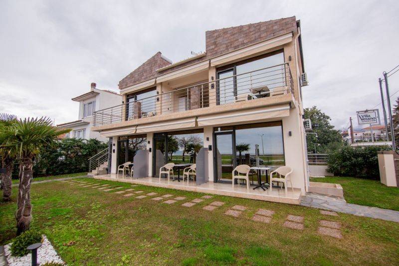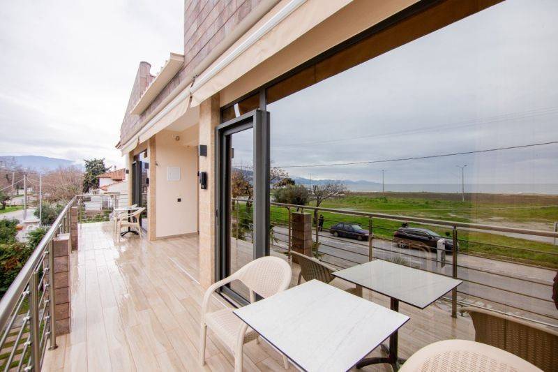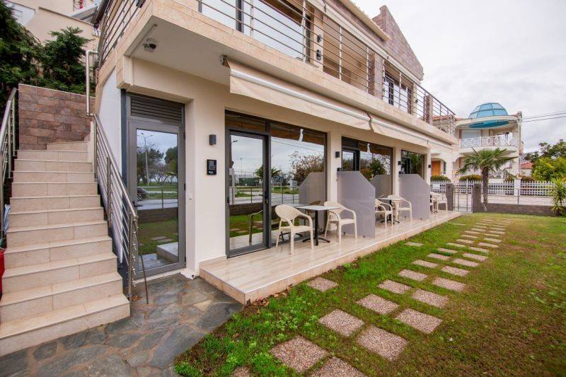 Rental rooms with a total area of 93.95sq.m. on a 241sq.m. plot, located in front of the sea in Asprovalta, Thessaloniki. The property consists of 5 modern, fully furnished and fully equipped studios. Each studio includes an open-plan space with a kitchenette and a private bathroom. They feature synthetic window frames, air conditioning (A/C), stainless steel railings, electric awnings, and a solar water heater. The apartments were fully renovated in 2024, offer unobstructed sea views, and are particularly bright. The minimal interior design is dominated by white tones and wooden surfaces. The outdoor area includes a well-maintained garden with trees, a storage room, and an outdoor shower. It is an excellent investment opportunity in a highly privileged location, with direct access to the central pedestrian street of Asprovalta, where shops for daily needs and dining options are located. The property has an eastern orientation, is just 160 meters from the sea, and is next to organized beach bars in the area.