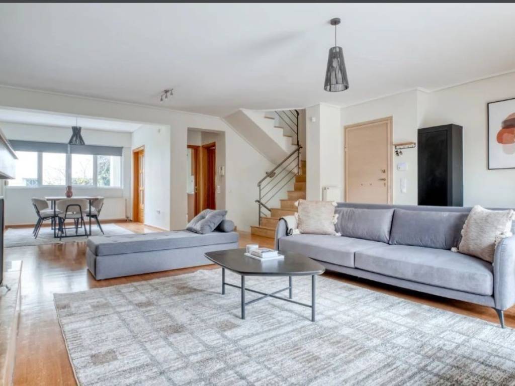 Εξαιρετική Μεζονέτα 301 τ.μ σε οικόπεδο 350 τ.μ κατασκευής 2003. η οποία αναπτύσσεται σε τρία επίπεδα Υπερυψωμένο Ισόγειο 84,68 τμ ,1ος Όροφος 72,43 τμ Σοφίτα 28,24 τμ, playroom 59,25 τμ και βοηθητικοί χώροι 56,85 τμ. 1.Υπερυψωμένο ισόγειο . Αποτελείται από πολύ ωραίο και φωτεινό χώρο υποδοχής-τραπεζαρίας με τζάκι , κουζίνα ανεξάρτητη , wc και δύο μεγάλες βεράντες . 2. 1ος όροφος. Αποτελείται από τρία μεγάλα υπνοδωμάτια εκ των οποίων το ένα είναι μάστερ , δύο μπάνια βεράντες. 3. Σοφίτα. Είναι πολύ άνετη και αποτελείται από ένα πολύ ωραίο και φωτεινό χώρο που μπορεί να χρησιμοποιηθεί ως υπνοδωμάτιο ή γραφείο , με πολλούς αποθηκευτικούς χώρους και με πρόσβαση στην ταράτσα με επληκτική θέα . 4. Το playroom το οποίο είναι πολύ φωτεινό αποτελείται από ευρύχωρο καθιστικό με υποδομή για κουζινάκι, ένα μεγάλο υπνοδωμάτιο, πλήρες μπάνιο, laundry room και άνετη αποθήκη με λέβητα. Διαθέτει αυτόνομη θέρμανση ανά επίπεδο με πετρέλαιο, κουφώματα αλουμινίου , διπλά τζάμια, σίτες, δρύινα πατώματα εξαιρετικής ποιότητας στον χώρο υποδοχής και στα υπνοδωμάτια και πλακάκι στους υπόλοιπους χώρους, πόρτα ασφαλείας, εντοιχιζόμενες ντουλάπες, αποθήκη , τζάκι, κλιματιστικά , συναγερμό, ηλιακό θερμοσίφωνα, υπόγεια θέση στάθμευσης για δύο αυτοκίνητα , ηλεκτρικές συσκευές, laundry room, κάμερες, θέα. Η μεζονέτα περιβάλλεται από άνω των 100 τ.μ. διαμορφωμένων κήπων αποκλειστικής χρήσης, εμπρός και πίσω. Βρίσκεται σε πολύ ωραίο και καταπράσινο σημείο κοντά στο κέντρο της Κηφισιάς, στον ΗΣΑΠ Κηφισιάς με άμεση πρόσβαση στους βασικούς οδικούς άξονες Είναι μία πλήρως αυτόνομη μεζονέτα πολύ καλής κατασκευής και αισθητικής, σε παράδρομο που διαχωρίζει διακριτικά το ακίνητο από τον κεντρικό δρόμο. Έχει γίνει ανακαίνιση το 2022 σε ηλεκτρολογικές και υδραυλικές εγκαταστάσεις, πατώματα , κουζίνα, μπάνια.