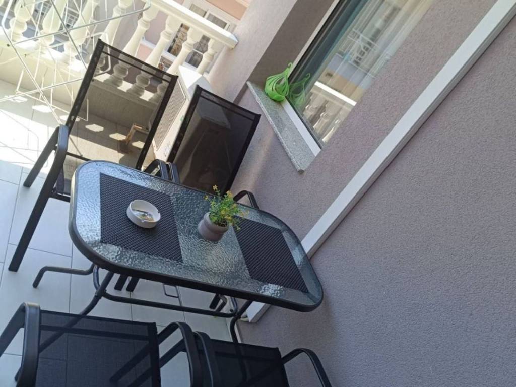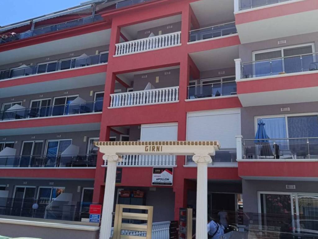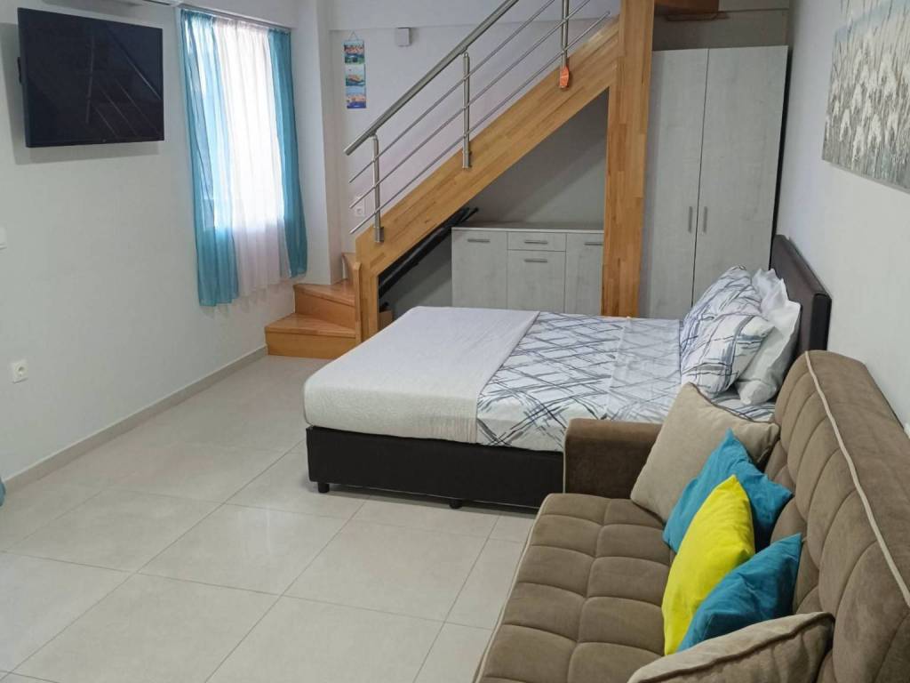 The LUXURY maisonette is located in Paralia, it is a luxurious maisonette of 50 sq.m and approximately 10 meters of balcony with air conditioning, seasonal outdoor pool and garden. The building has an elevator for the convenience of the tenants. The apartment consists of 1 bedroom (large double bed and wardrobe, flat screen TV with satellite channels), fully equipped kitchen (oven, extractor, ceramic hob, microwave and refrigerator, hot water kettle, toaster, coffee maker, sufficient cutlery, cups for coffee, tea, water, wine, whiskey etc., kitchen utensils), 1 bathroom with shower (washing machine). The living room is equipped with a king-size bed, a sofa bed for two people, a bar counter and bar stools for dining, a large smart flat-screen TV with satellite channels. For greater convenience, the accommodation provides bath and kitchen towels, duvets and bed linen. The apartment has a terrace, which is equipped with garden furniture and can accommodate 4-6 people.