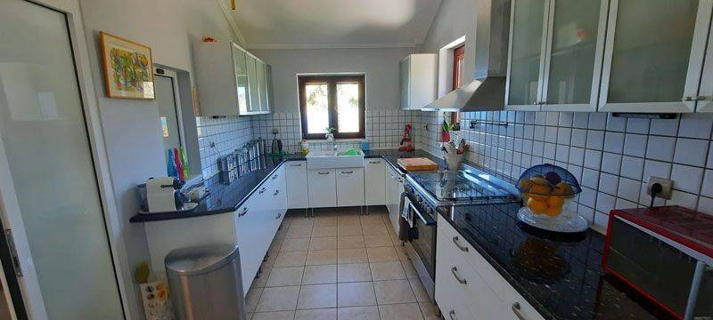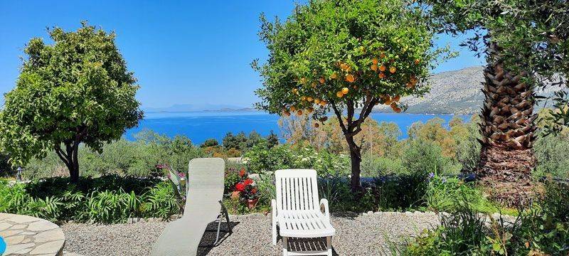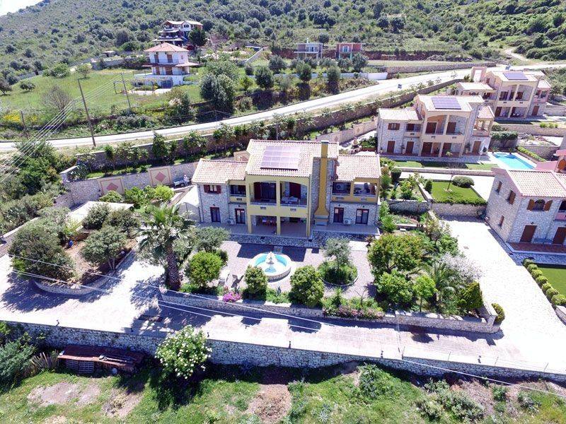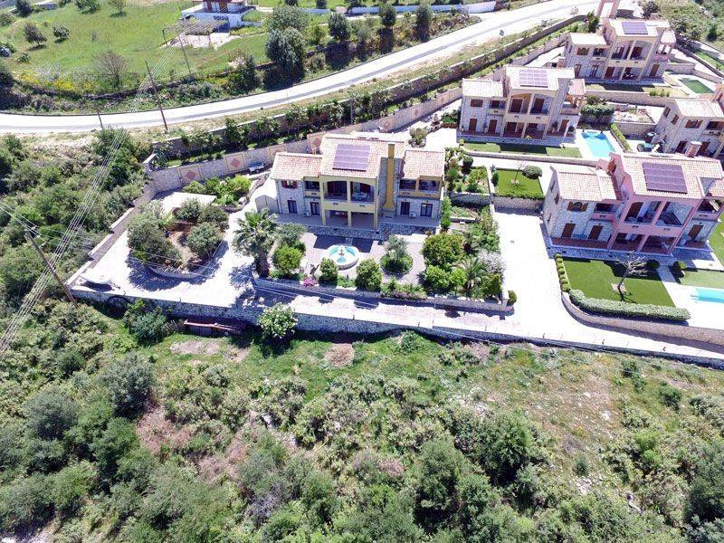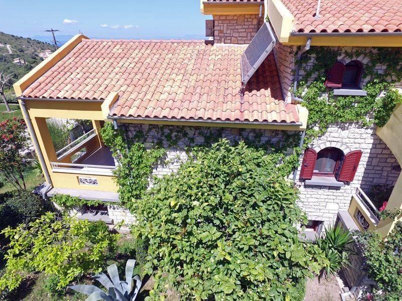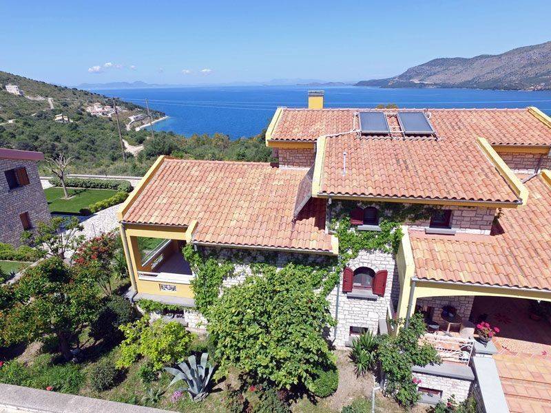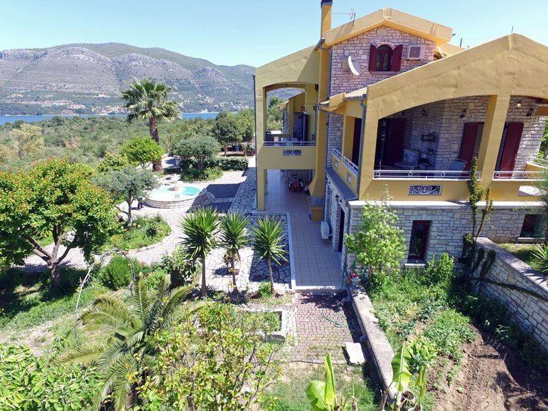 VILLA SUNSET Villa Sunset is the largest property within an exclusive residential complex, offering approximately 340 sqm of living space on a 1,000 sqm plot. Built in 2008 in accordance with Greek construction regulations, the villa meets high structural standards, including reinforced earthquake-resistant design. The property is situated within a fully walled and gated complex of six high-quality stone houses, overlooking the stunning blue bay of the Ionian Sea. The elevated position guarantees spectacular panoramic views and unforgettable sunsets. A prestigious main entrance with an electric gate and paved driveway leads directly to the front entrance of the villa. The landscaped garden, featuring roses, olive trees, and various fruit trees, enhances the property’s elegant character. Ample on-site parking is available. A secondary access road leads conveniently to the ground-floor apartments and garden areas. The sea and beach are within walking distance and can also be accessed by car via a side road of the complex. The nearby village of Plataria, located approximately 2 km away, offers a full range of amenities including cafés, restaurants, three supermarkets, schools, and additional daily conveniences. Of particular note is the well-constructed and secure marina, making the location especially attractive for boat owners. Layout Ground Floor: Two fully independent apartments, each comprising an open-plan living and kitchen area, one double bedroom, and a spacious bathroom. Both units are equipped with built-in wardrobes and underfloor heating. Large patio doors open onto an expansive terrace with a built-in masonry barbecue area. This level is ideal for extended family use, hosting guests, or generating rental income. First Floor: A spacious separate kitchen, a large open-plan living and dining area with fireplace, one bathroom, and a double bedroom with built-in wardrobe. The entire floor benefits from underfloor heating. Second Floor: A private master suite with en-suite bathroom, built-in wardrobe, and access to a balcony offering impressive panoramic views. Outdoor Area The well-maintained garden features a decorative stone fountain, gravel landscaping, flower beds, olive trees, and various fruit plants, including a banana tree. A large side storage and utility room houses the gas heating system as well as electricity and water installations. Planning permission for the construction of a swimming pool has already been granted. An exceptional villa in a prime coastal location, offering versatile use—whether as a prestigious private residence, a luxury holiday home, or a high-yield investment property.