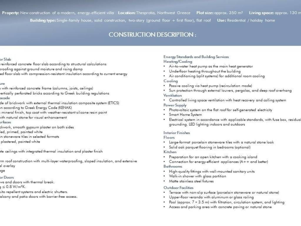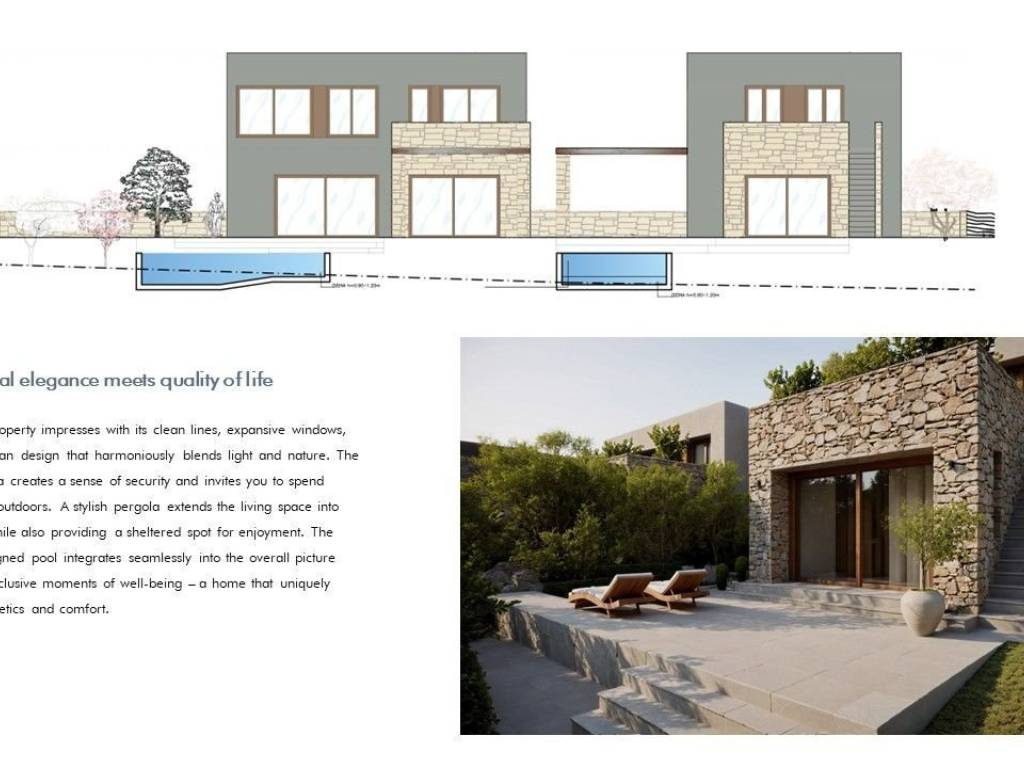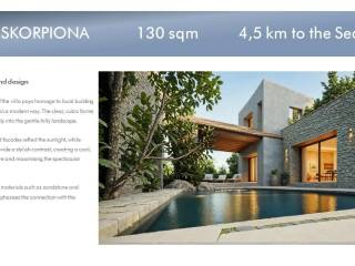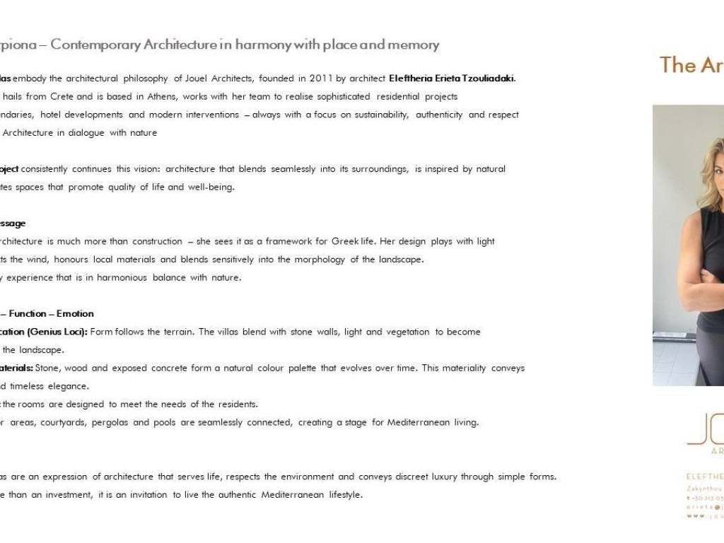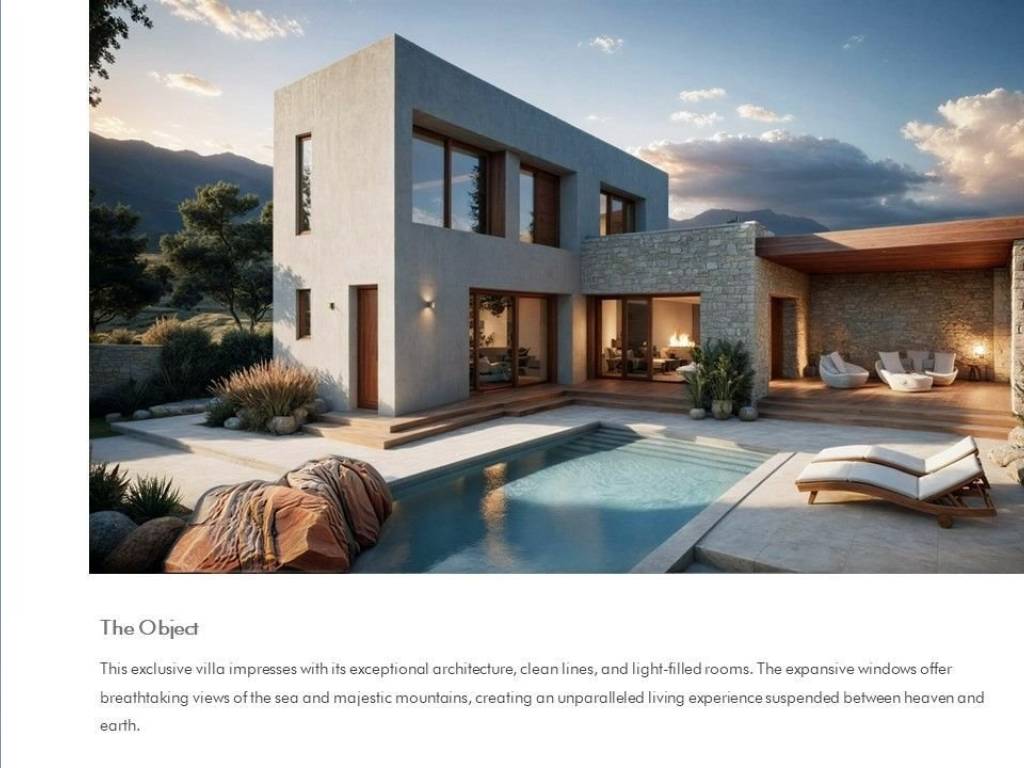 Exclusive Villa with Breathtaking Sea and Mountain Views A Refuge Nestled Between the Mountainous Landscape and the Ionian Sea Welcome to a unique property that perfectly blends luxury with the lush beauty of Greek nature. Majestically situated on a hilltop, this exclusive villa offers unparalleled 180-degree views of the crystal-clear Ionian Sea and the surrounding hills. It is the ideal retreat for those seeking tranquility, privacy, and the incomparable interplay of verdant mountains and deep blue sea. Architecture and Design The villa's architecture pays homage to local building traditions, reinterpreted in a modern style. The clean, cubic forms blend harmoniously into the rolling hills. Facades bathed in soft colors reflect sunlight, while large windows create a stylish contrast, generating a cool, inviting atmosphere and maximizing the spectacular views. The use of natural materials such as sandstone and polished stone further emphasizes the villa's connection to its surroundings. Exquisite Outdoor Area The outdoor area is the heart of the villa. A spacious sun terrace with a white stone floor invites you to relax. A spectacular infinity pool seems to flow directly into the horizon, visually merging with the Ionian Sea. The terraced gardens are an oasis for the senses, with fragrant rosemary, wild thyme, ancient olive trees, orange and lemon trees, and colorful oleander bushes. The outdoor area is the perfect place to peacefully enjoy the famous Greek sunsets over the sea. Elegant Interior Design The villa's interior exudes understated elegance and a cool tranquility. Large windows and glass doors flood every room with light and offer breathtaking views of the sea and the surrounding hills. The polished stone floors provide a pleasant coolness on warm days. Furnishing a villa is a wonderful challenge, as a Mediterranean style offers a wealth of possibilities that can be interpreted in both traditional and modern ways. Regardless of personal taste, it's crucial to create an atmosphere that is both functional and aesthetically pleasing. Enjoy the process and transform your villa into a true sanctuary.