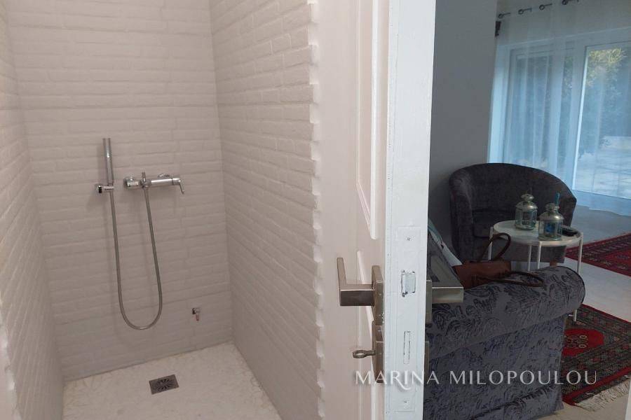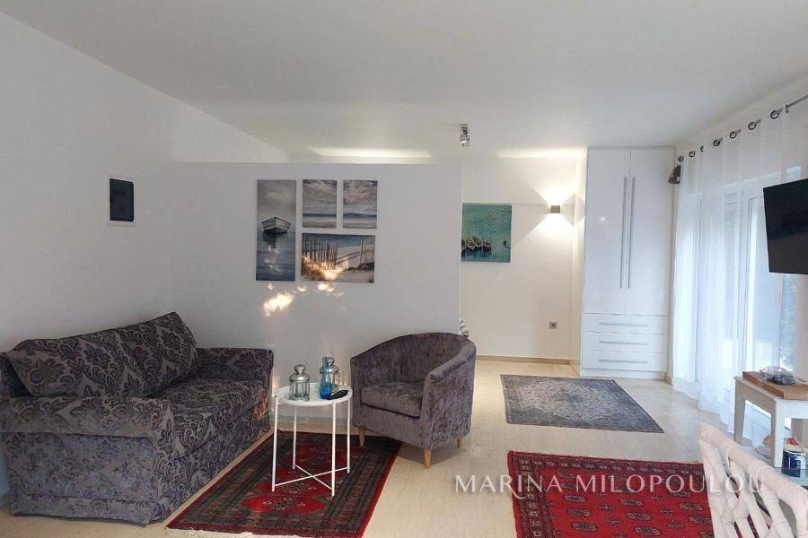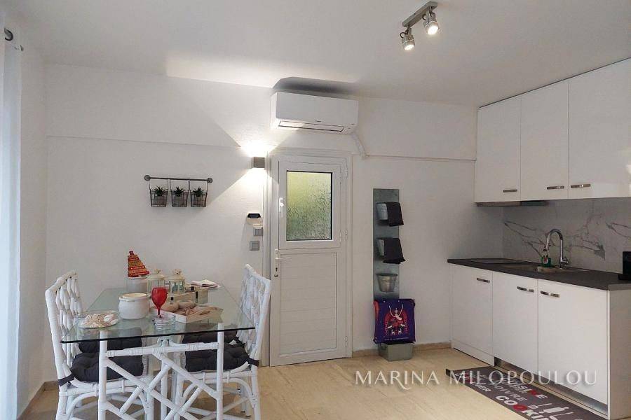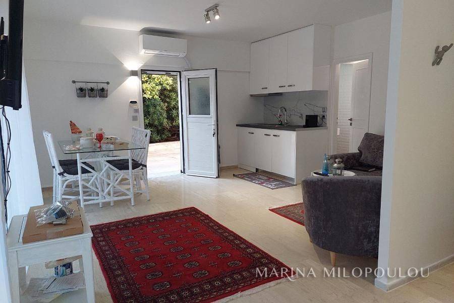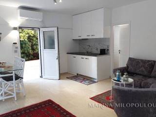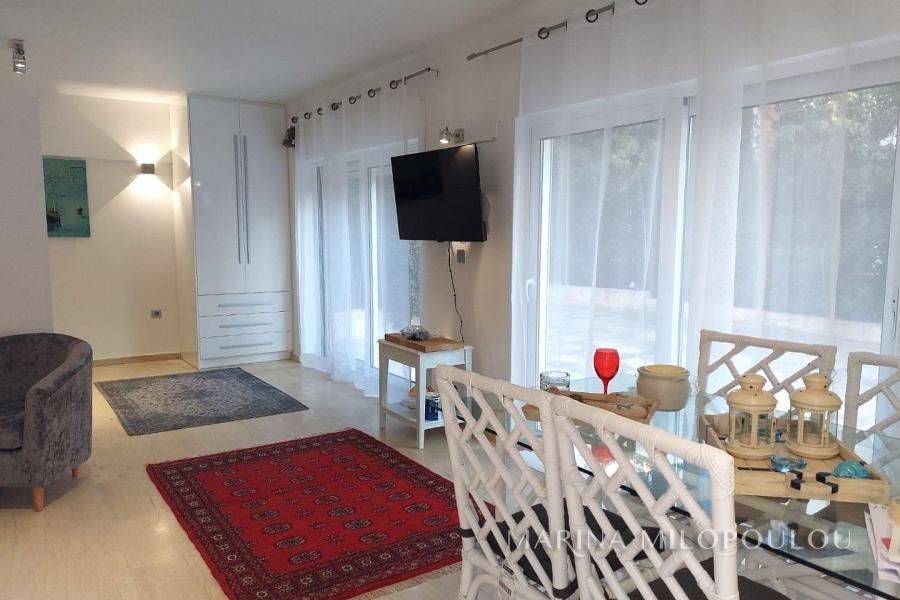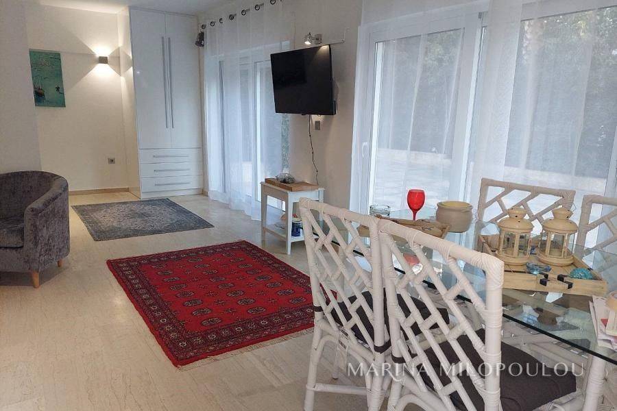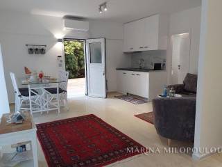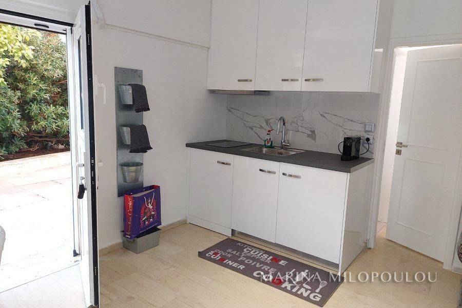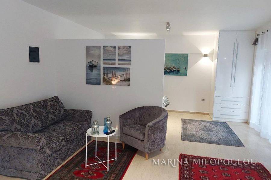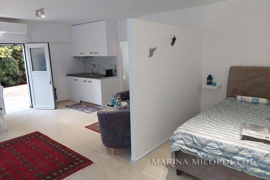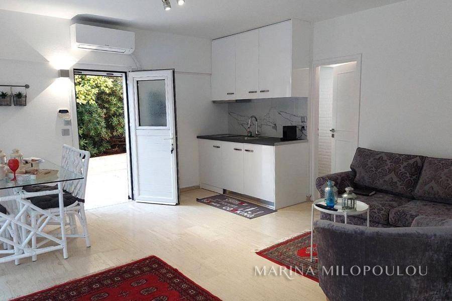 Voula, a single space, fully furnished studio, on the ground floor, 40 sq.m. It is on the side of the building with an independent entrance, with a green view and a good layout. It features double glazing, electric shutters, security door, alarm, 1 inverter air conditioner for cooling - heating, washing machine - dryer, refrigerator, ceramic hobs, TV. internet connection South sunny orientation, very quiet location, close to local market. No maintenance expenses, electricity bill 90€/month aprox. Pets not allowed. Distance from the local market 350 meters, from bus stop 200m, 1.2km from the Tram terminal and Voula's organized beach, 1.5 km from the square of Voula.