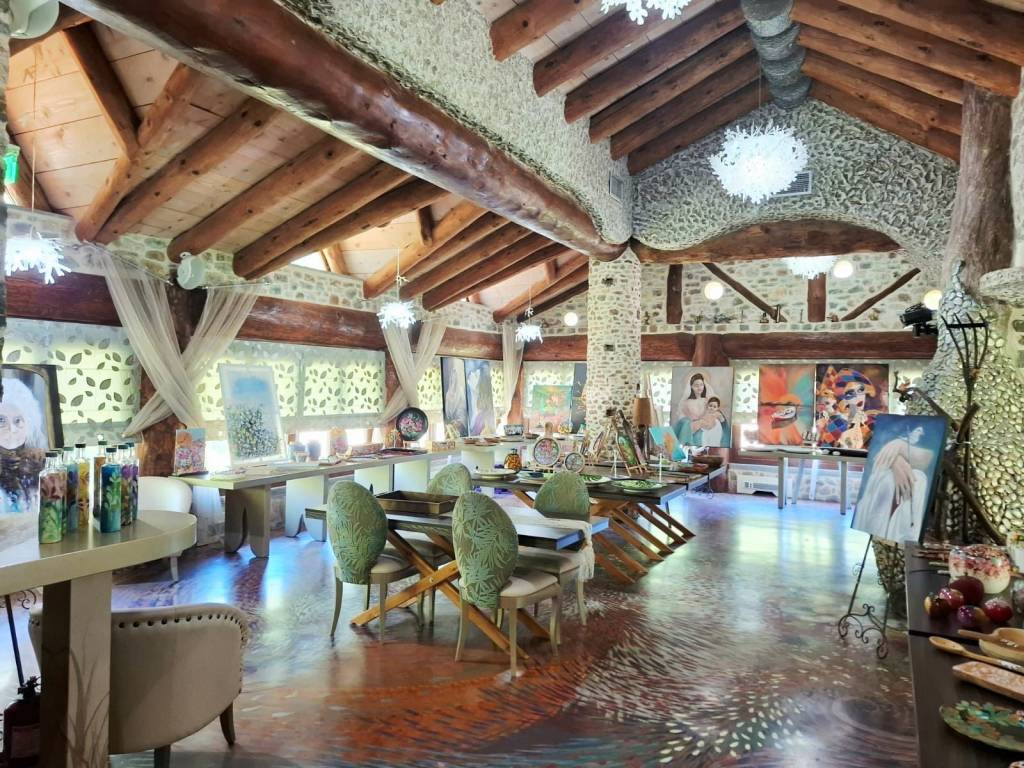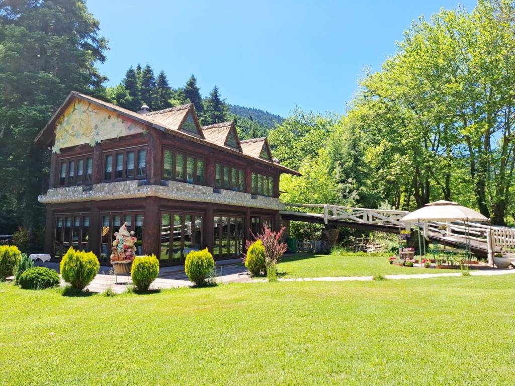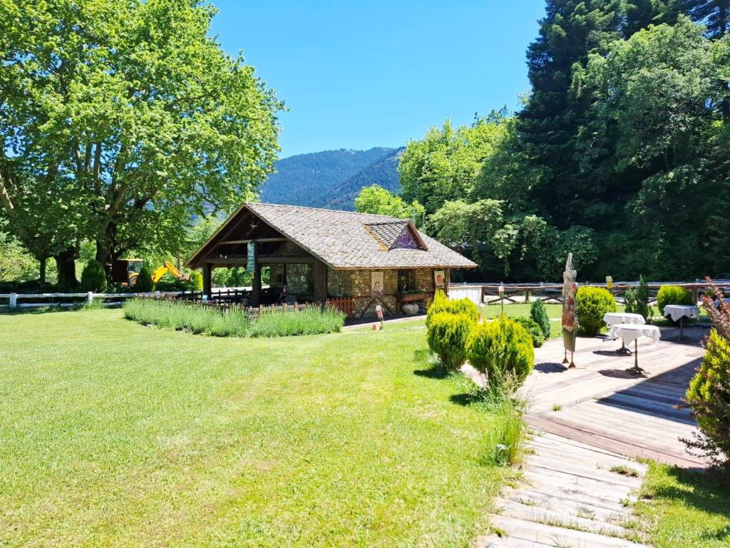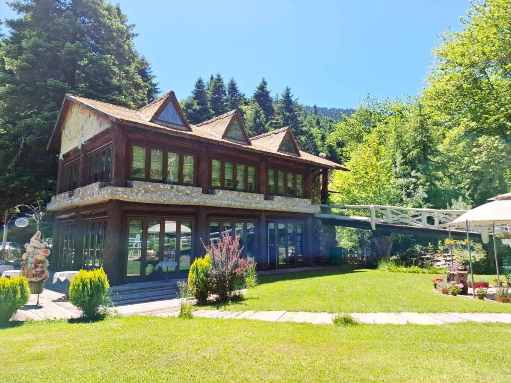 Καλώς ήρθατε σε ένα μοναδικό και υψηλής αισθητικής χώρο σε μια υπέροχη τοποθεσία όπου η τέχνη συναντά τη φύση, όπου ο καμβάς των χρωμάτων και των πινέλων ενώνεται με το καμβά του φυσικού τοπίου, όπου το πνεύμα και η ψυχή δίνουν τέρψη στο σώμα. Πρόκειται για ένα ακίνητο, επαγγελματικός πολυχώρος που έχει άδεια λειτουργίας ως εστίαση και καφέ, κόσμημα της περιοχής που δένει αρμονικά με το φυσικό περιβάλλον. Βρίσκεται 7 χλμ από το Καρπενήσι, σε αγροτεμάχιο εμβαδού 3.374 τμ, κατασκευής 2011. Η συνολική επιφάνεια των κυρίων χώρων είναι 302 τμ και αποτελείται από 2 κτίρια, το κτίριο Α’ με ισόγειο 30 τμ και βοηθητικό χώρο υπογείου 63 τμ και το κτίριο Β’ με με ισόγειο 152 τμ και 1ο όροφο 120 τμ περίπου. Το κτίριο Α’ βρίσκεται μπροστά στον κόμβο και δημιουργήθηκε με την λογική ότι μπορεί να χρησιμοποιηθεί ως κατάστημα mini market, ταχυφαγείο και εργαστήρι παρασκευής διαφόρων προϊόντων. Προς το παρόν λειτουργεί ως αποθήκη. Το πλεονέκτημα είναι ότι βρίσκεται πάνω στον κόμβο και μέσα στο χώρο στάθμευσης, εξυπηρετώντας άμεσα χωρίς να απομακρύνεται κάποιος από τον κεντρικό δρόμο και ταυτόχρονα χωρίς να σταθμεύει πάνω σε αυτόν. Σημειώνεται ότι δεν υπάρχουν ανάλογα σημεία με τέτοιες δυνατότητες στη περιοχή και στον συγκεκριμένο οδικό άξονα. Το ισόγειο του κτιρίου Β’ λειτουργούσε ως καφέ και ο 1ος όροφος ως χώρος εστίασης. Στη παρούσα φάση το ισόγειο λειτουργεί ως γλυκοπωλείο – καφέ και το 1ος ως έκθεση ζωγραφικής. Ο χώρος του κτιρίου Β’ είναι διαμορφωμένος έτσι ώστε στον 1ο όροφο να λειτουργεί το κυρίως εστιατόριο με ανεξάρτητη είσοδο εξωτερικά, εφόσον χρειαστεί, για εκδηλώσεις όπως γενέθλια, πάρτι, βαφτίσεις και άλλα που εξυπηρετούν χώροι εστίασης. Υπάρχει επιπλέον και ένας εσωτερικός μικρός παιδότοπος για να απασχολούνται παιδιά και ένα μικρό δώμα για την εξυπηρέτηση του προσωπικού με τουαλέτα. Στον εξωτερικό χώρο και πίσω από το κατάστημα, κάτω από τα πλατάνια μπορεί να λειτουργεί χώρος προς εστίαση και εκδηλώσεις όπως και παιδική χαρά. Στο κτήμα υπάρχει η δυνατότητα να γίνουν γάμοι και άλλου είδους εκδηλώσεις με χωρητικότητα περίπου 120 άτομα στον 1ο όροφο και 60 στο ισόγειο του κτιρίου Β’, ενώ δύναται να εξυπηρετήσει πάνω από 200 άτομα. Το ακίνητο είναι κατασκευασμένο με δέντρα από τα δάση της Ευρυτανίας και πέτρα που είναι φερτή ποταμίσια ύλη προερχόμενη κατά την εκσκαφή. Όλη η κατασκευή είναι χειροποίητη, τα δέντρα έχουν ανοίξει, έχει αφαιρεθεί ο πυρήνας τους και έχει τοποθετηθεί σίδερο και μπετόν στις κολώνες και τα δοκάρια του μεγάλου κτηρίου. Η πέτρα έχει χρησιμοποιηθεί για το χτίσιμο των τειχών με πλάτος περίπου 80 εκατοστά, ενδιάμεσα των οποίων έχει προστεθεί ειδική μόνωση. Η θεμελίωση του κτιρίου Β’ είναι RADIE ενώ στο Α’ υπάρχει υπόγειο με ράμπα εισόδου. Με παρόμοιο τρόπο έχει κατασκευαστεί και το κτίριο Α’, ενώ εσωτερικά έχει προστεθεί και μόνωση τύπου μανδύα. Τα δέντρα στο κτίριο Α’ είναι συμπαγή και στη στέγη του έχουν τοποθετηθεί 6.000 περίπου χειροποίητες πεταλίδες μαρμάρου που έχουν βιδωθεί πάνω στην ξύλινη στέγη κατασκευασμένη από ατόφια δέντρα ελατοπεύκης. Η στέγη του κτιρίου Β’ είναι από 91 συμπαγή δέντρα που δημιουργούν στέγαστρα καθώς περνάνε έξω από τους τοίχους, συμπαγωποιημένο καλάμι (THACHEK) με βαρίδια στους κορφιάδες κατασκευασμένα από πέτρα και περιμετρικά του ορόφου έχουν χτιστεί ζαρντινιέρες για λουλούδια και φυτά. Τα κουφώματα είναι 